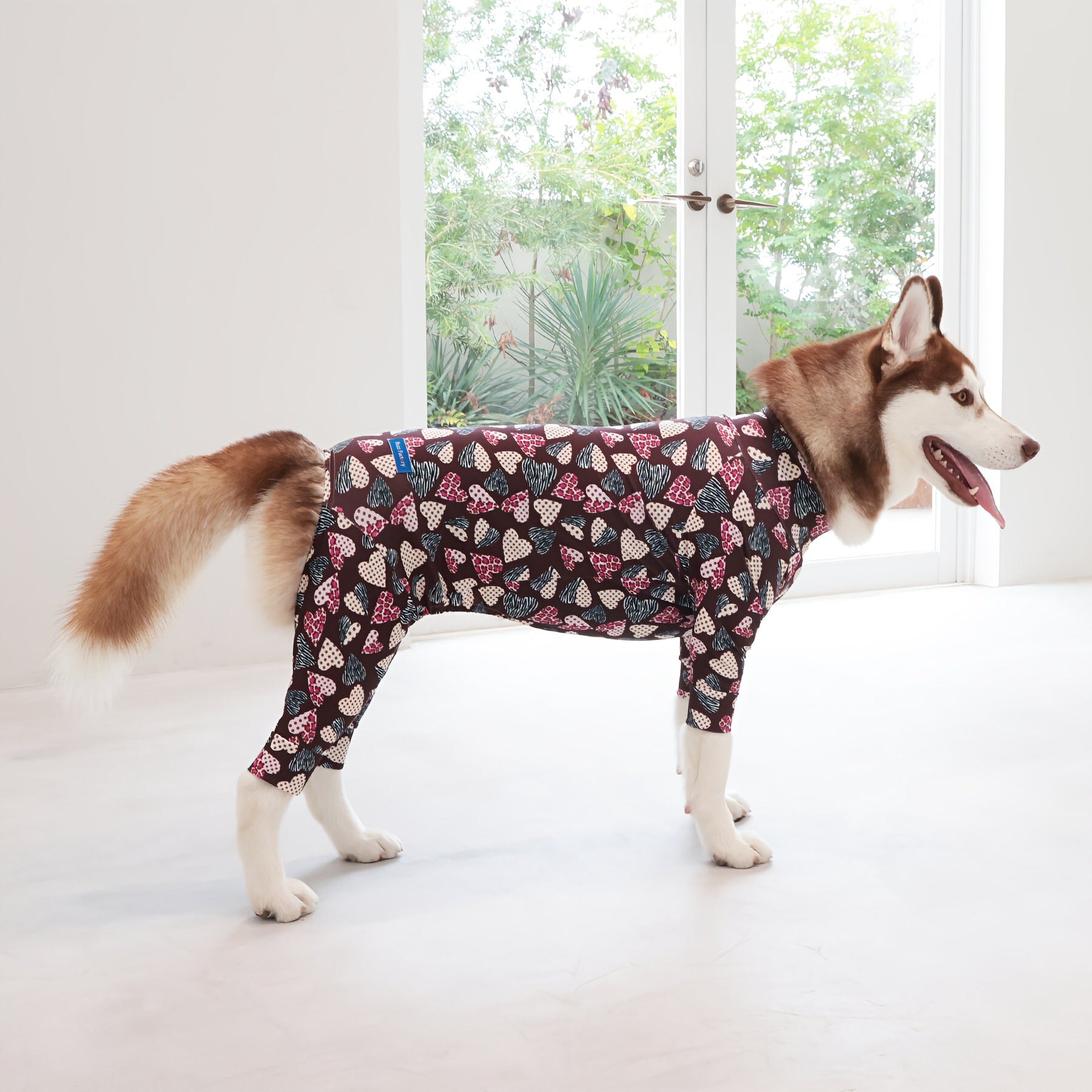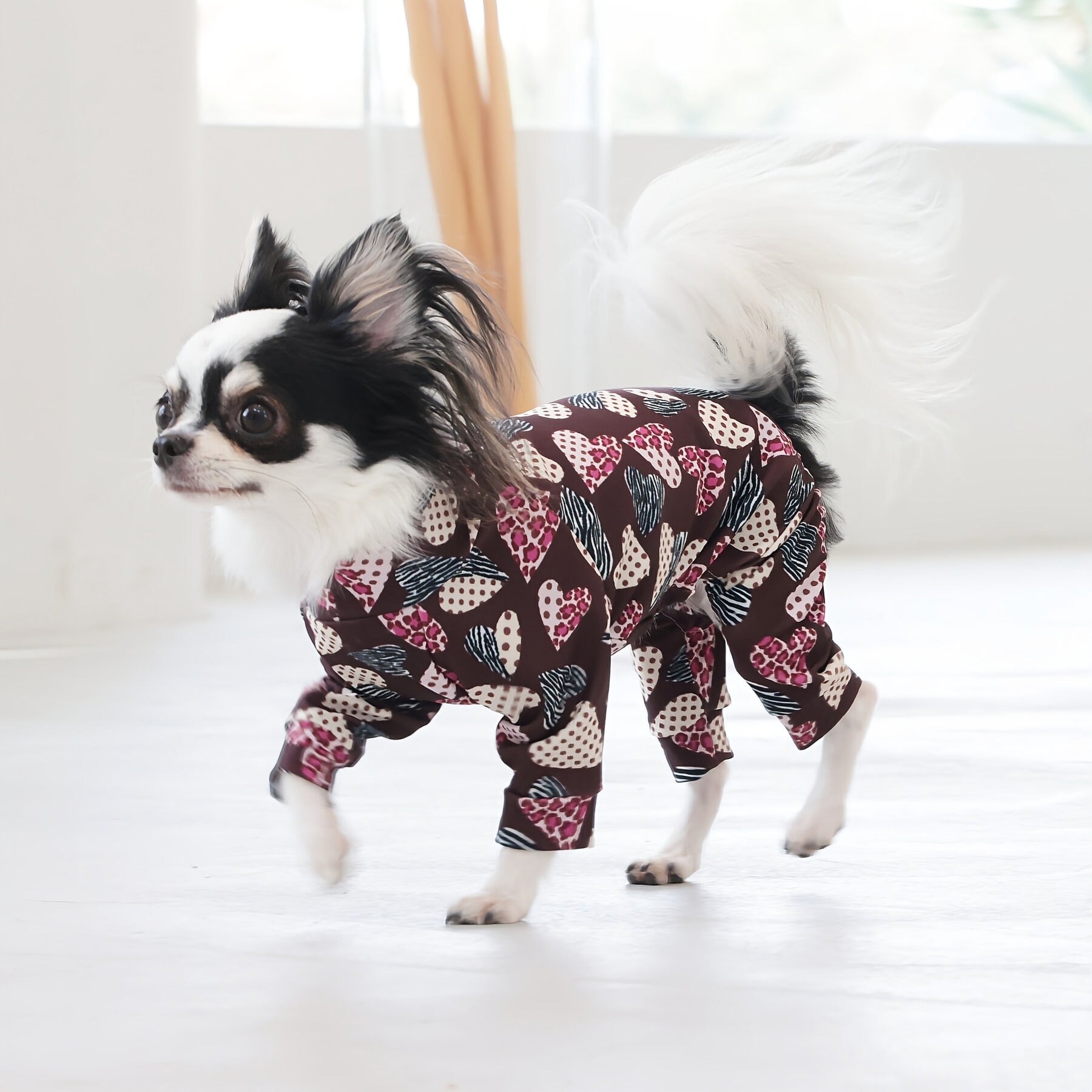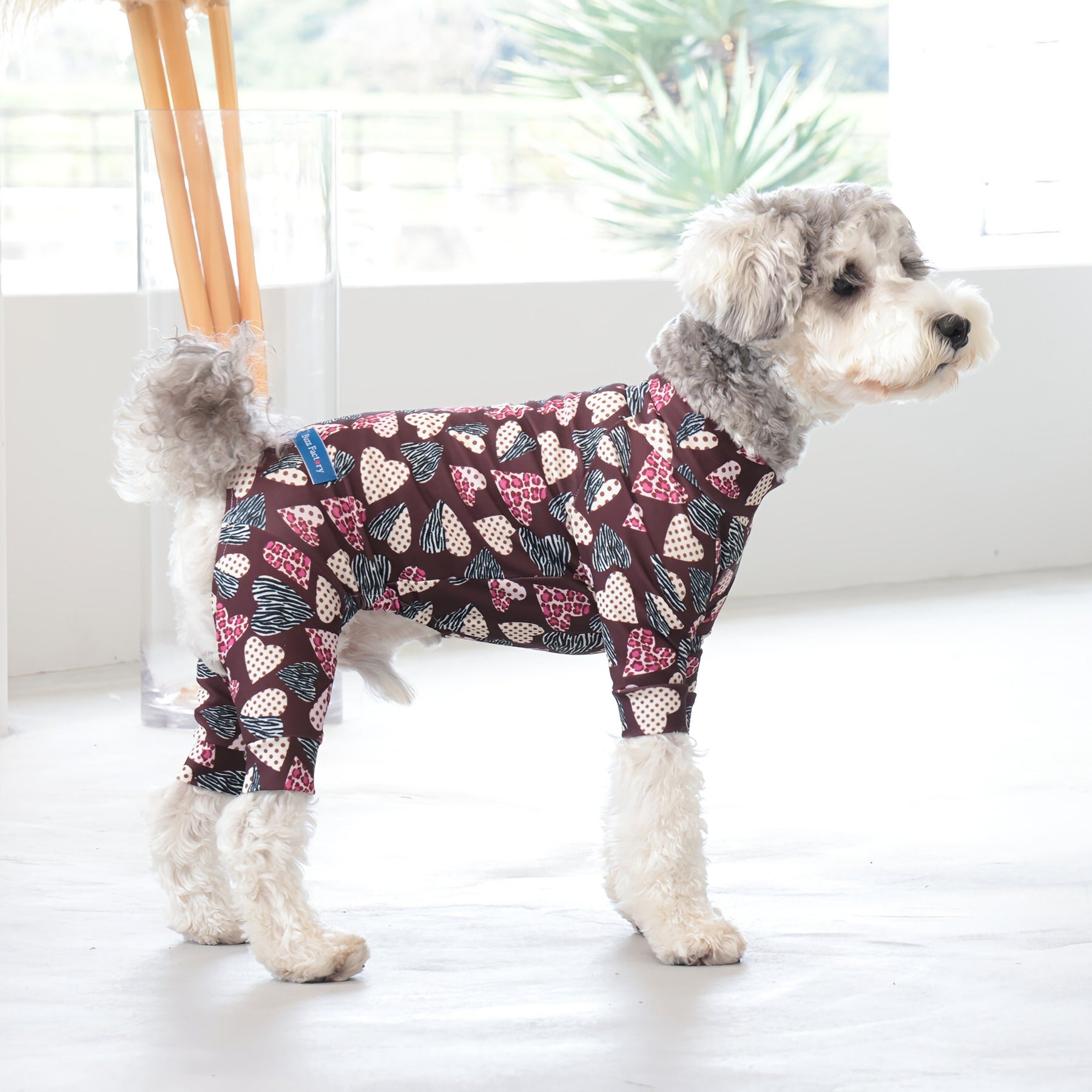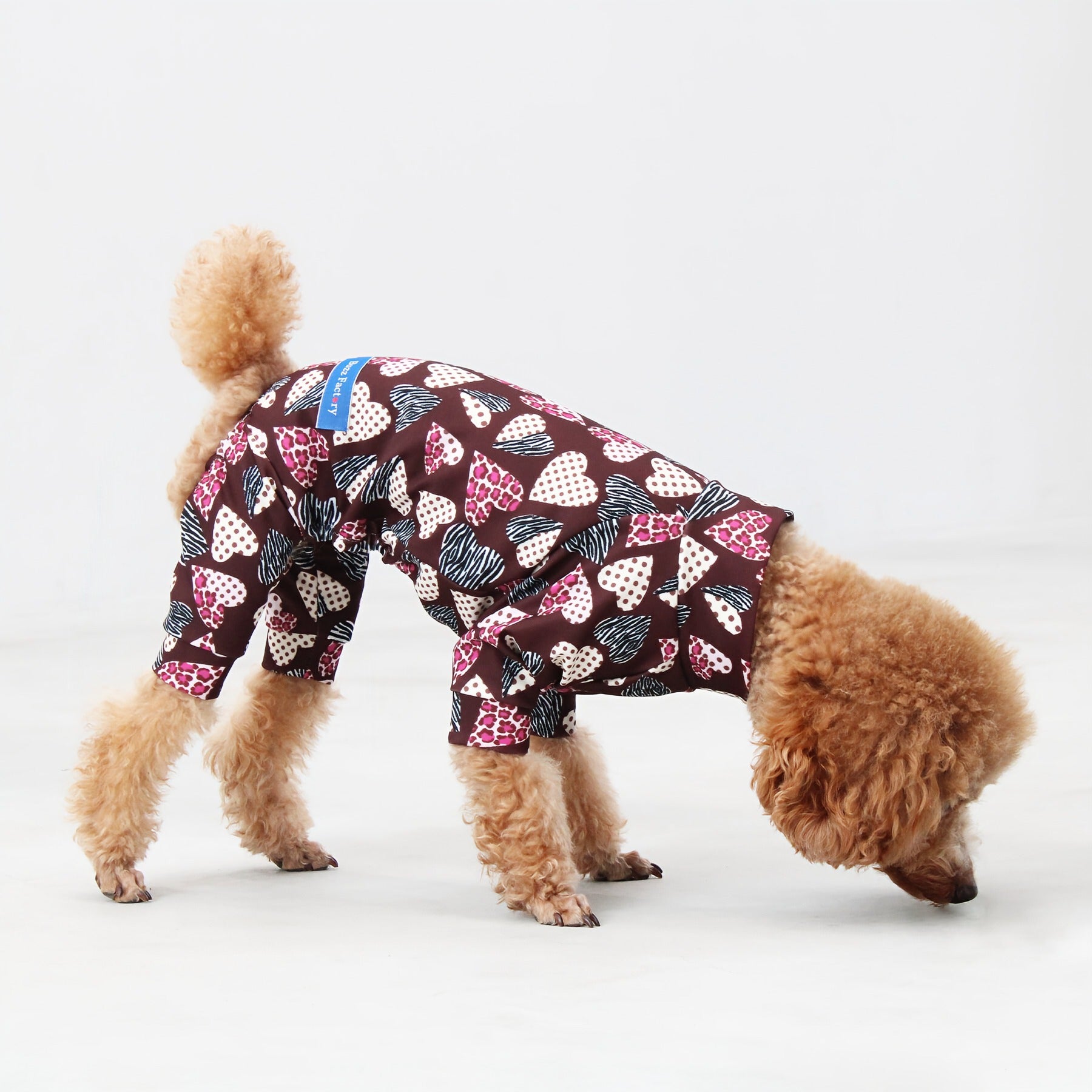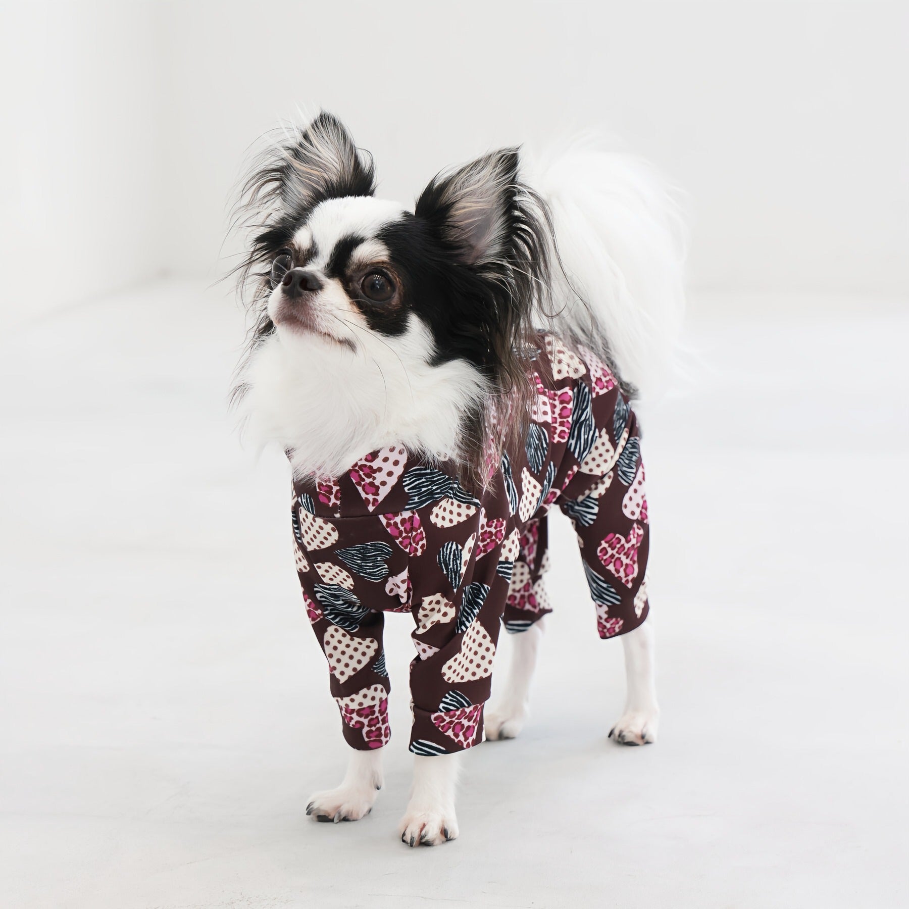 ※サイズによって値段が異なりますので、サイズをご選択していただき、値段をご確認ください。商品説明クールと可愛らしさ、両立が難しい2つの雰囲気を表現したアニマルハート。レオパードやジブラをハートやドットで可愛しく仕上げております。ロンパースでは珍しい、黒色を地色に採用していることもこだわりポイントのひとつです。こちらのカラフルロンパース シリーズは伸縮性や形態安定にとても優れており、オールシーズンに活躍。また、アウトドアやお出かけに最適なアイテムで、飼い主の方々にとっては日本製・洗濯可能なので安心かつイージーケアな商品です。わんちゃん用のウェアには散歩中やドッグランでの防汚効果や野生のノミ・ダニ予防、屋内や車内での抜け毛予防、手術や治療後の舐め防止など、多くの利点がございます。【モデル】トイプードル(Lサイズ着用)【モデル】ビジョンフリーゼ(Lサイズ着用)【モデル】ジャックラッセルテリア(LLサイズ着用)【モデル】ミニチュアシュナウザー(LLサイズ着用)【モデル】シェットランドシープドッグ(4Lサイズ着用)【モデル】スタンダードプードル(※0歳)(4Lサイズ着用)【モデル】フレンチブルドッグ(FPGサイズ着用)※新色、「チョコ」より撮影モデルが変更いたします。【モデル①】チワワ(体重:2kg、着用:Mサイズ)【モデル②】ティーカップ・プードル(体重:1.5kg、着用:Mサイズ)【モデル③】ジャック・ラッセル・テリア(体重:6kg、着用:Lサイズ)【モデル④】トイ・プードル(体重:3kg、着用:Lサイズ)【モデル⑤】ミニチュア・シュナウザー(体重:9kg、着用:LLサイズ)【モデル⑥】ビション・フリーゼ(体重:9.5kg、着用:3Lサイズ)【モデル⑦】シベリアン・ハスキー(体重:22kg、着用:5Lサイズ)【モデル⑧】イングリッシュ・ゴールデン・レトリーバー(体重:28kg、着用:6Lサイズ)【モデル⑨】フレンチ・ブルドッグ(体重:11.8kg、着用:FPGサイズ)サイズS, M, L, 2L(LL), 3L, 4L, 5L, 6L, DFS, DFM, FPG※サイズ測定はサイズ表をご覧ください。素材 / 仕様ポリエステル 83%、ポリウレタン 17%ロンパースタイプ(4つ足用)素材感生地の厚さ:普通透け感:透けない伸縮性:あり裏地:なしポケット:なし内容量本製品×1原産国日本洗濯絵表示洗濯可能本製品のお取り扱い-