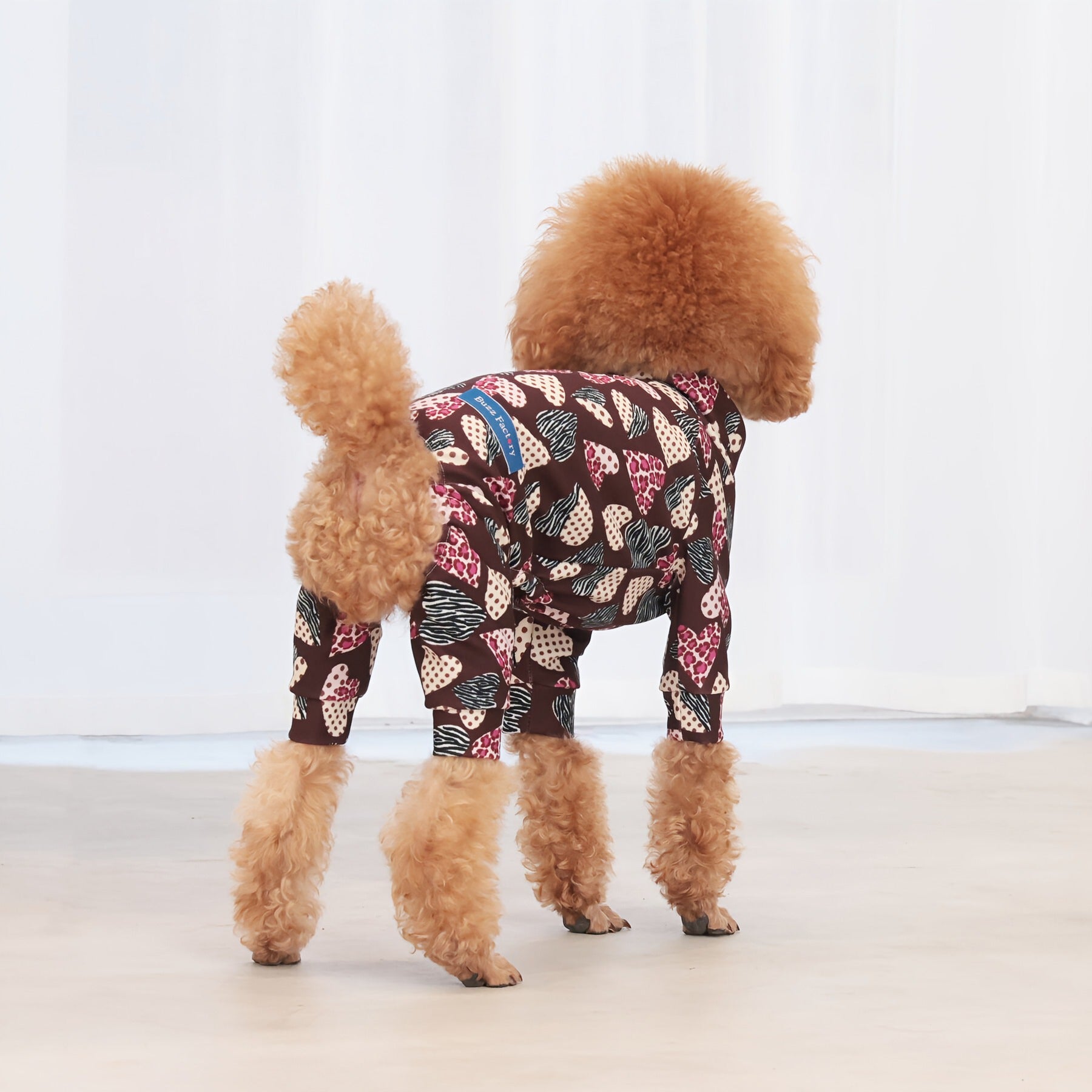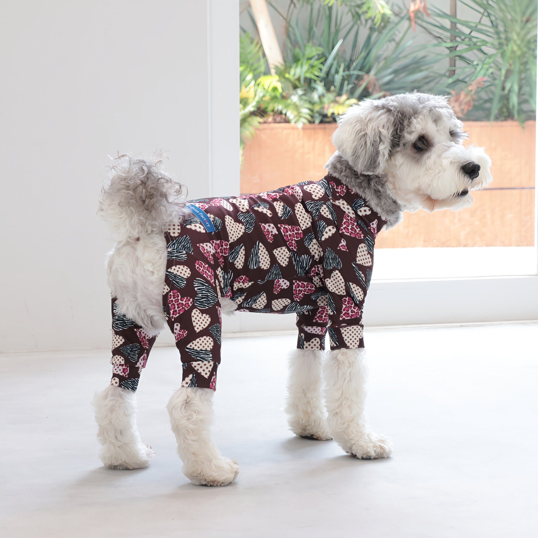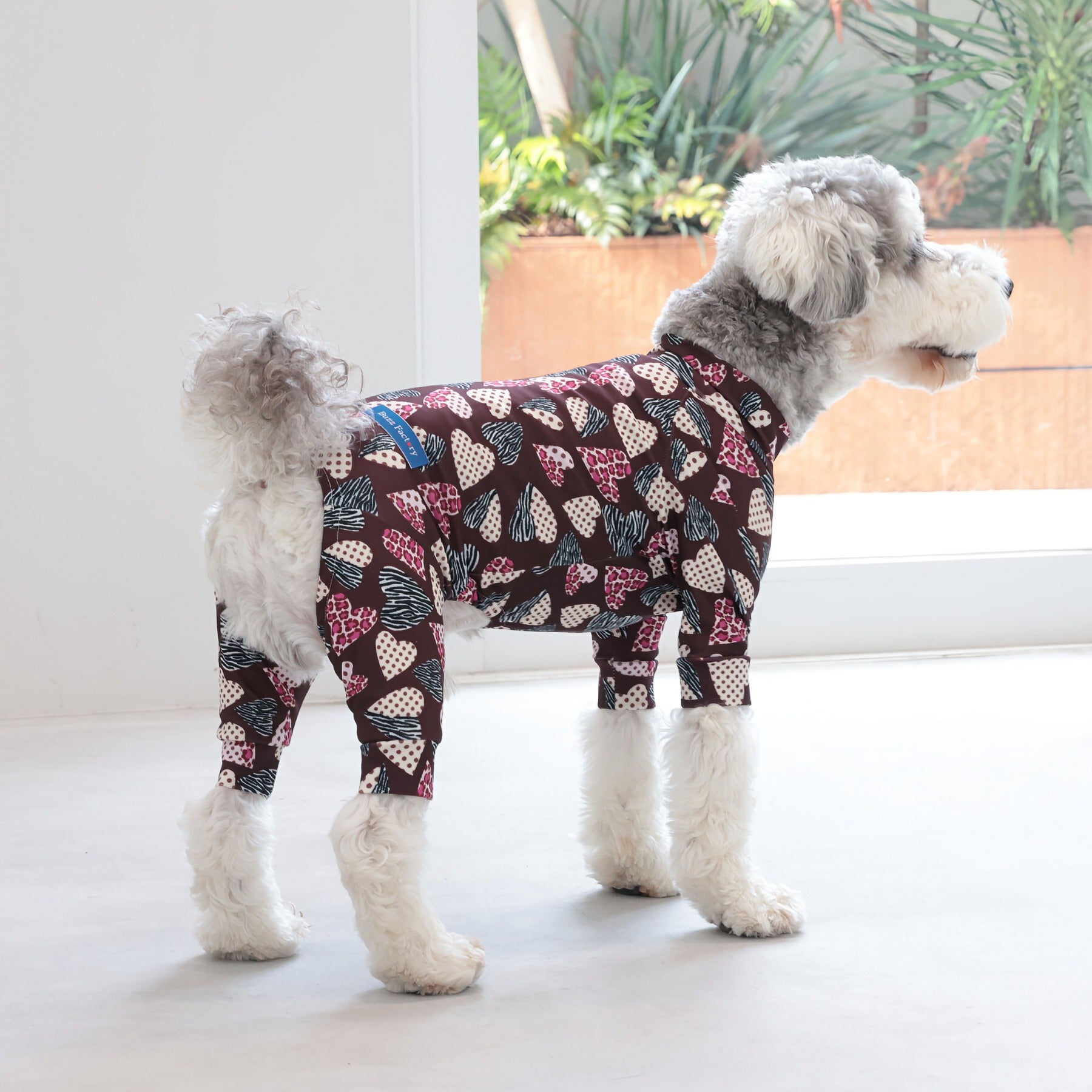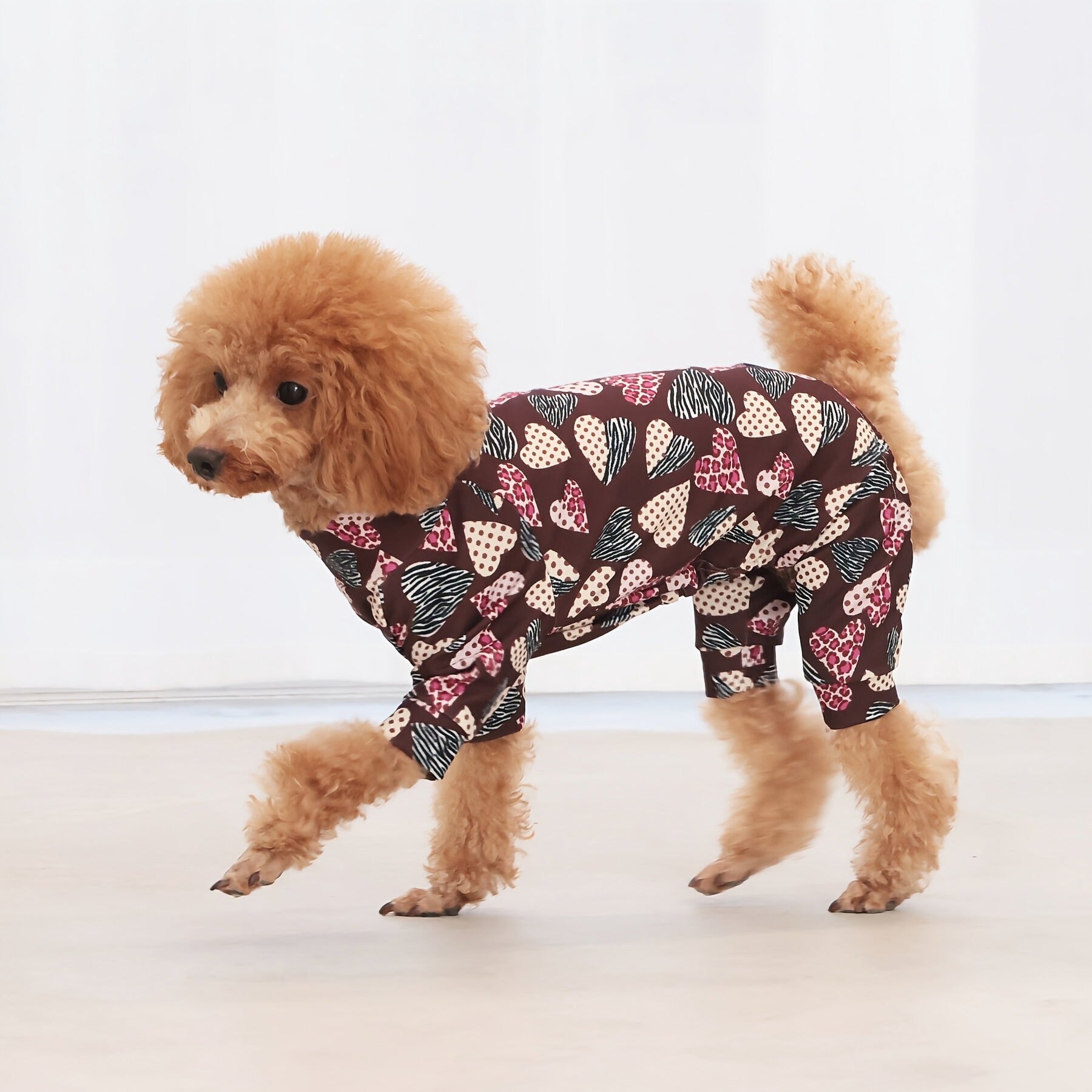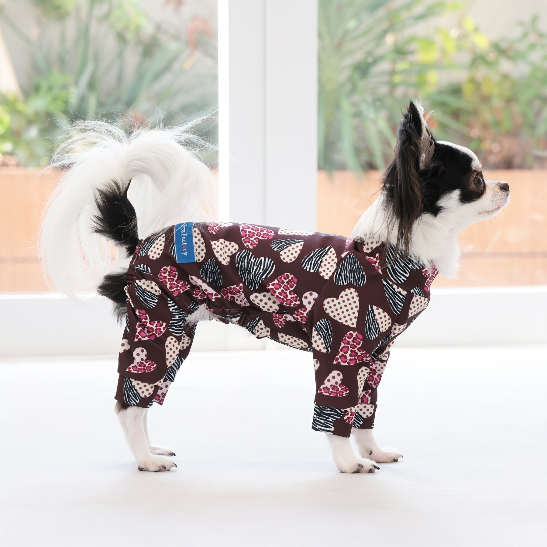 ※サイズによって値段が異なりますので、サイズをご選択していただき、値段をご確認ください。商品説明クールと可愛らしさ、両立が難しい2つの雰囲気を表現したアニマルハート。レオパードやジブラをハートやドットで可愛しく仕上げております。ロンパースでは珍しい、黒色を地色に採用していることもこだわりポイントのひとつです。こちらのカラフルロンパース シリーズは伸縮性や形態安定にとても優れており、オールシーズンに活躍。また、アウトドアやお出かけに最適なアイテムで、飼い主の方々にとっては日本製・洗濯可能なので安心かつイージーケアな商品です。わんちゃん用のウェアには散歩中やドッグランでの防汚効果や野生のノミ・ダニ予防、屋内や車内での抜け毛予防、手術や治療後の舐め防止など、多くの利点がございます。【モデル】トイプードル(Lサイズ着用)【モデル】ビジョンフリーゼ(Lサイズ着用)【モデル】ジャックラッセルテリア(LLサイズ着用)【モデル】ミニチュアシュナウザー(LLサイズ着用)【モデル】シェットランドシープドッグ(4Lサイズ着用)【モデル】スタンダードプードル(※0歳)(4Lサイズ着用)【モデル】フレンチブルドッグ(FPGサイズ着用)※新色、「チョコ」より撮影モデルが変更いたします。【モデル①】チワワ(体重:2kg、着用:Mサイズ)【モデル②】ティーカップ・プードル(体重:1.5kg、着用:Mサイズ)【モデル③】ジャック・ラッセル・テリア(体重:6kg、着用:Lサイズ)【モデル④】トイ・プードル(体重:3kg、着用:Lサイズ)【モデル⑤】ミニチュア・シュナウザー(体重:9kg、着用:LLサイズ)【モデル⑥】ビション・フリーゼ(体重:9.5kg、着用:3Lサイズ)【モデル⑦】シベリアン・ハスキー(体重:22kg、着用:5Lサイズ)【モデル⑧】イングリッシュ・ゴールデン・レトリーバー(体重:28kg、着用:6Lサイズ)【モデル⑨】フレンチ・ブルドッグ(体重:11.8kg、着用:FPGサイズ)サイズS, M, L, 2L(LL), 3L, 4L, 5L, 6L, DFS, DFM, FPG※サイズ測定はサイズ表をご覧ください。素材 / 仕様ポリエステル 83%、ポリウレタン 17%ロンパースタイプ(4つ足用)素材感生地の厚さ:普通透け感:透けない伸縮性:あり裏地:なしポケット:なし内容量本製品×1原産国日本洗濯絵表示洗濯可能本製品のお取り扱い-