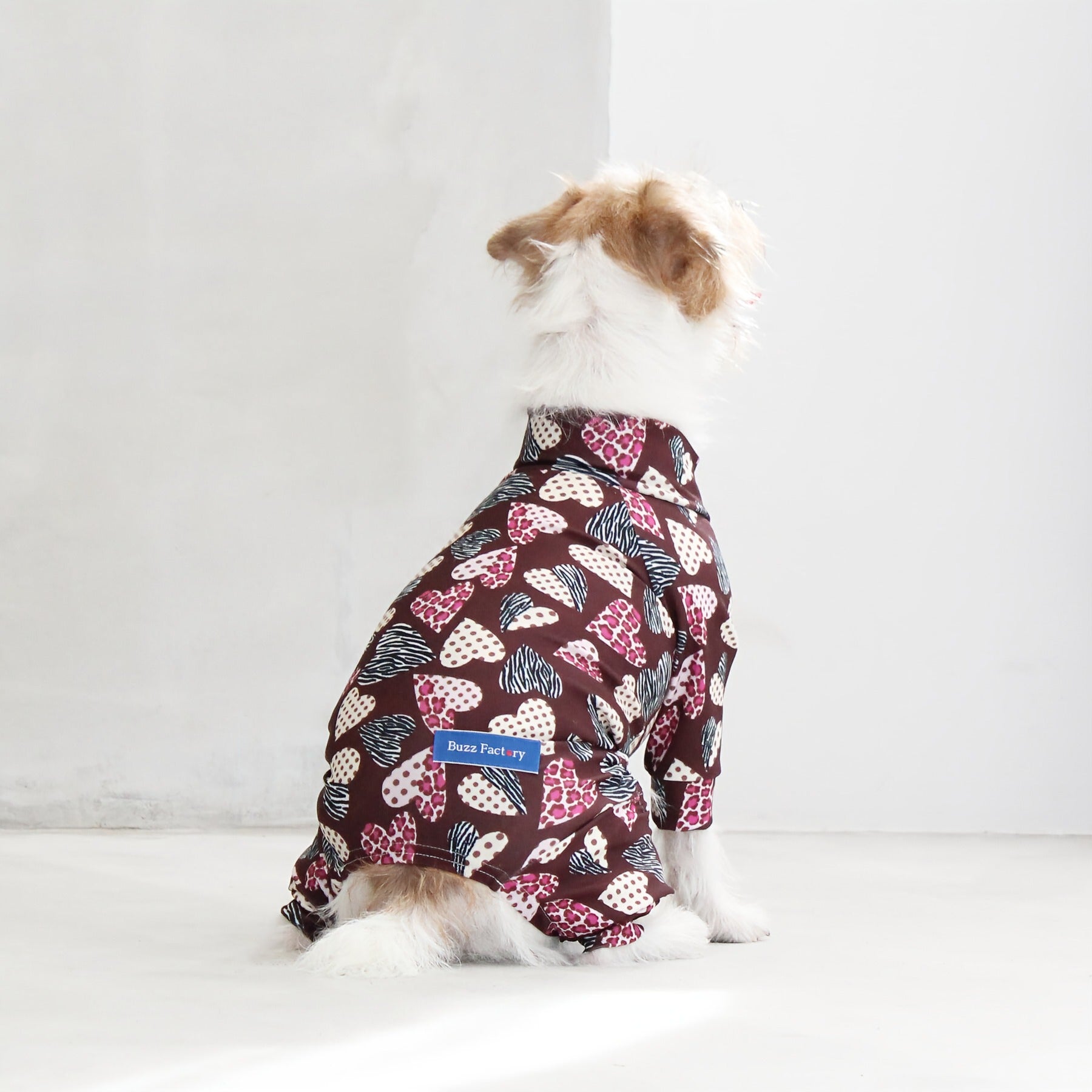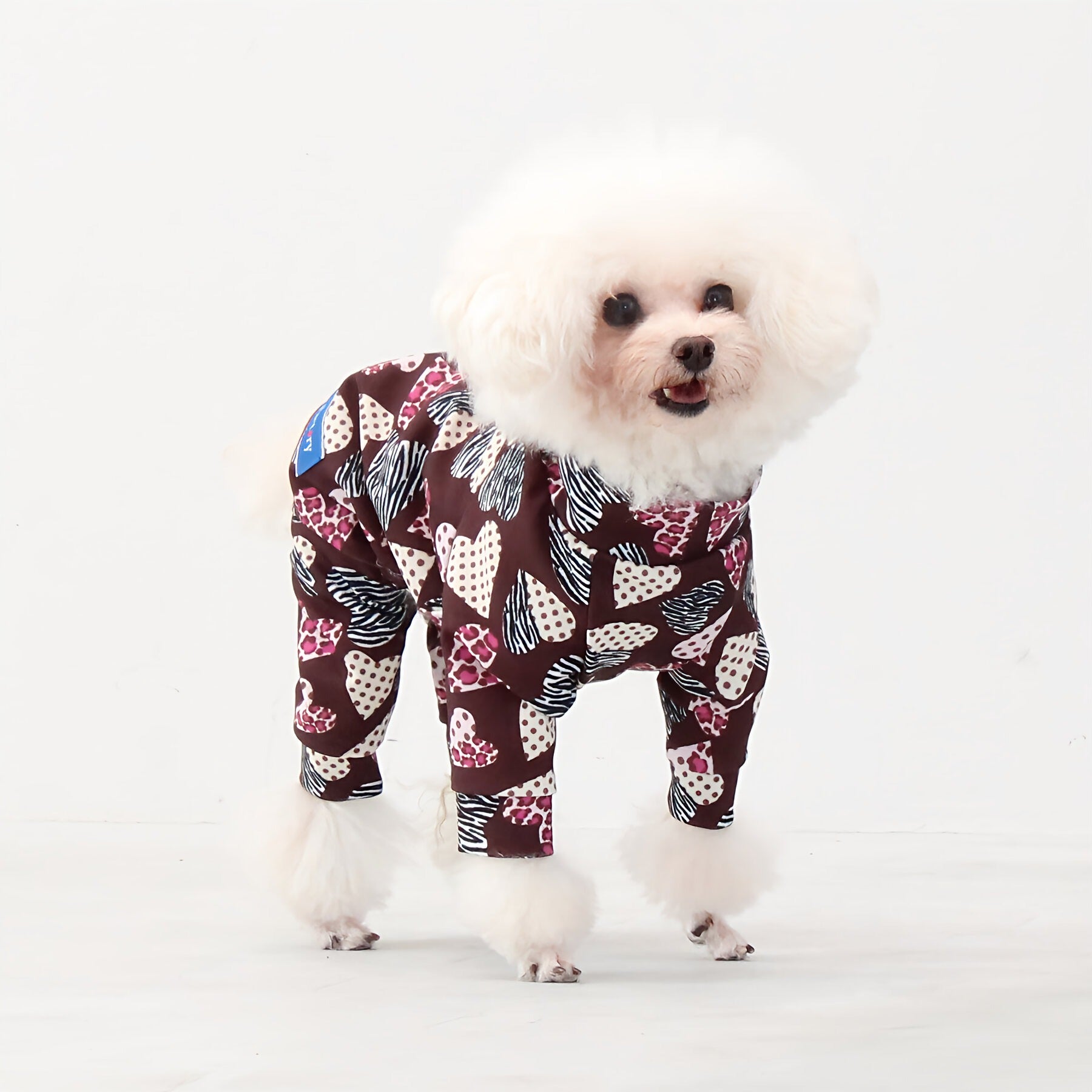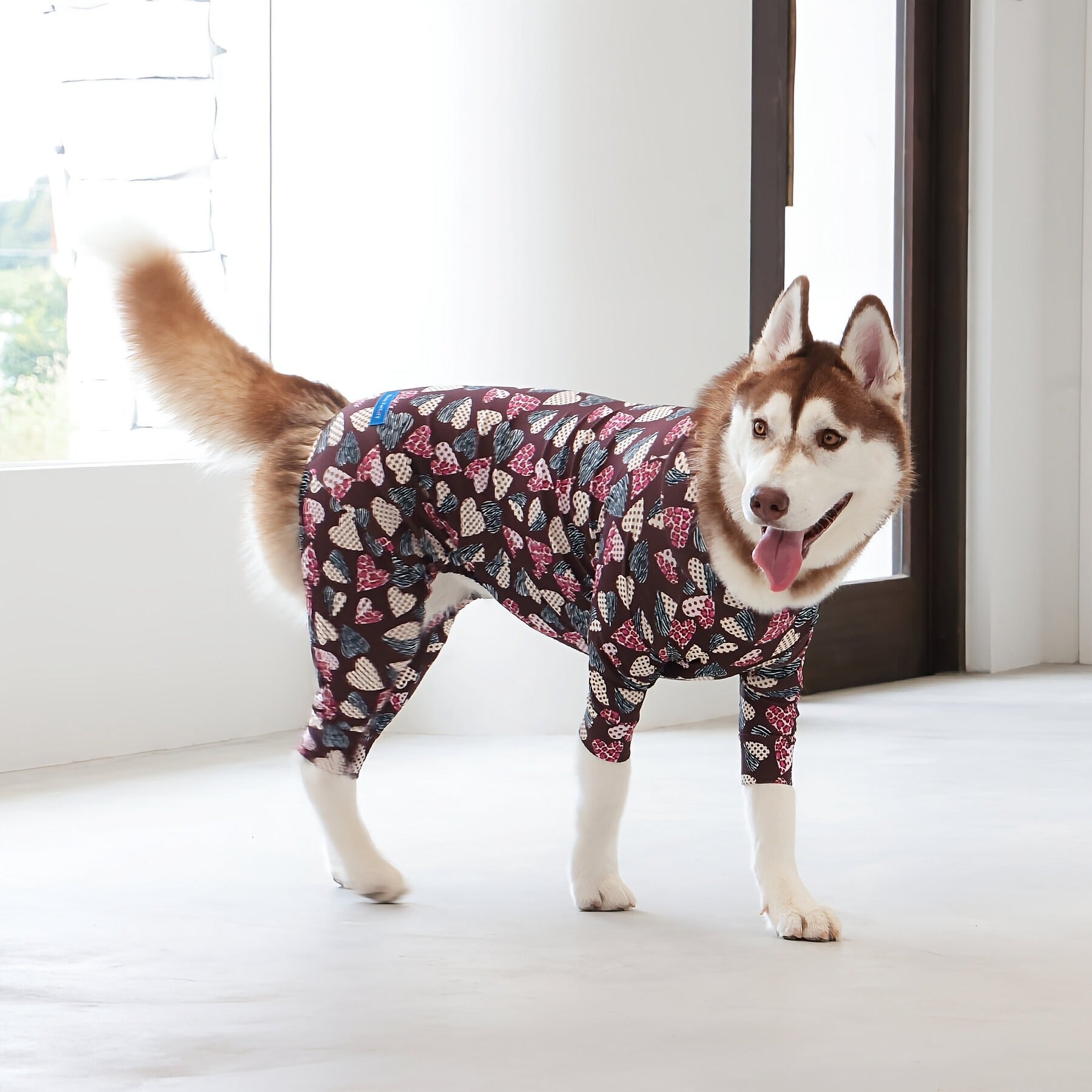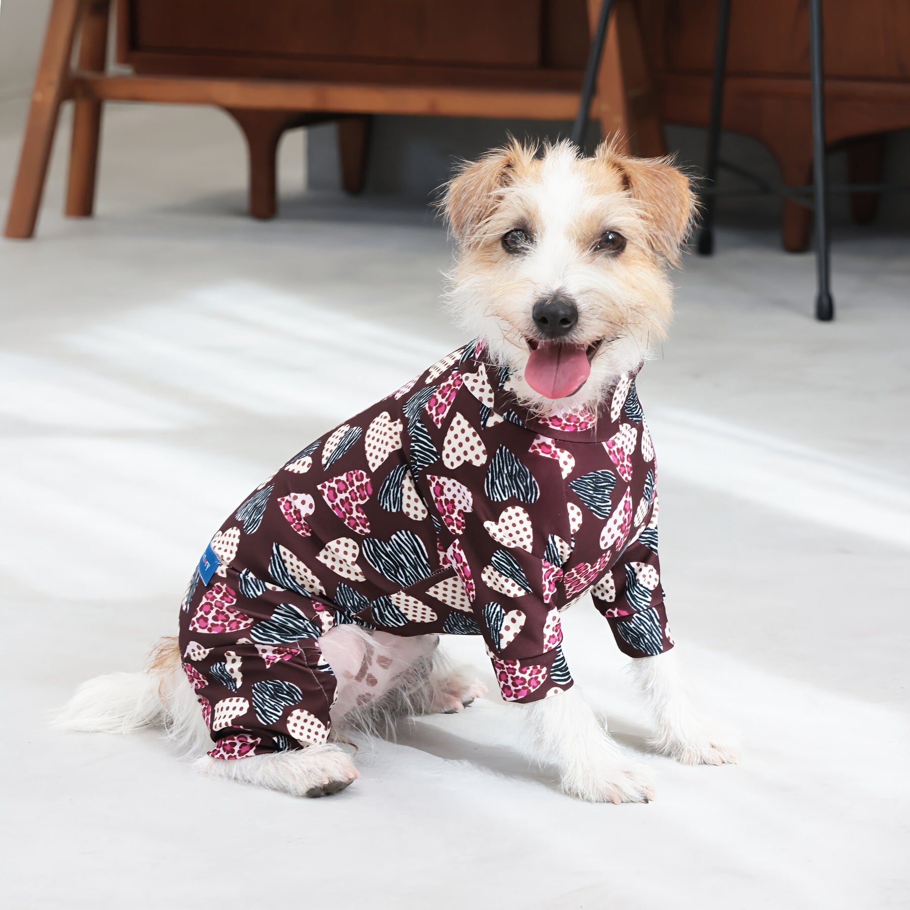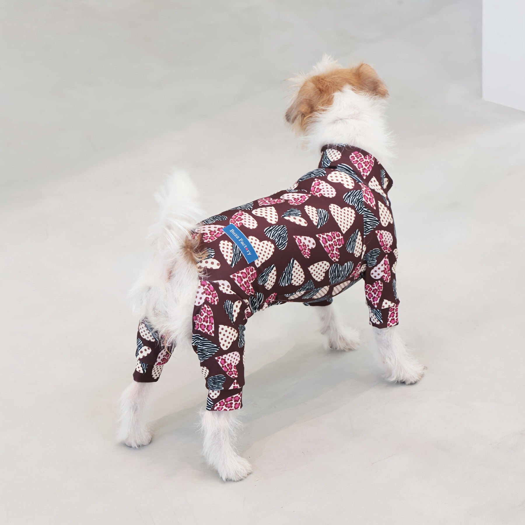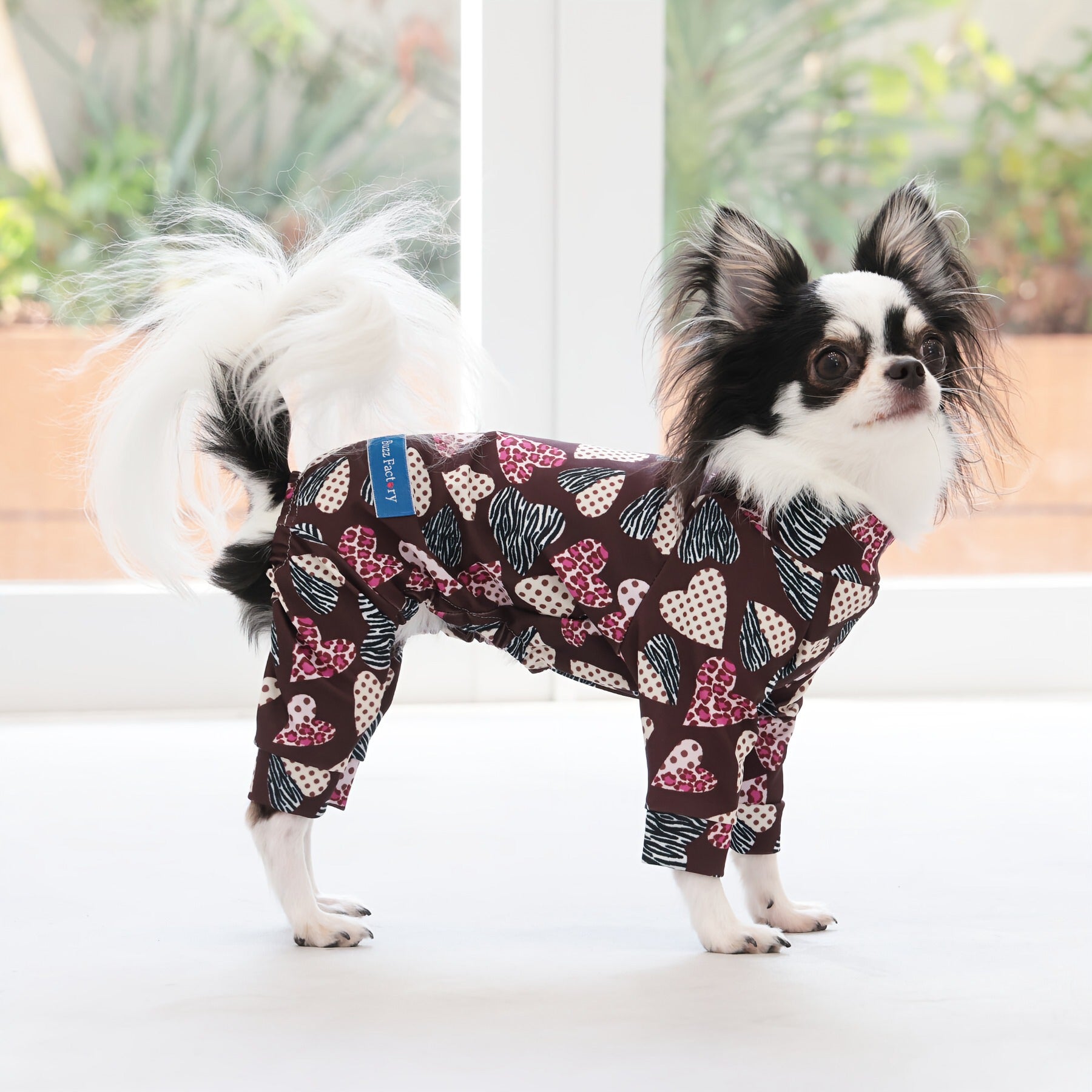 ※サイズによって値段が異なりますので、サイズをご選択していただき、値段をご確認ください。商品説明クールと可愛らしさ、両立が難しい2つの雰囲気を表現したアニマルハート。レオパードやジブラをハートやドットで可愛しく仕上げております。ロンパースでは珍しい、黒色を地色に採用していることもこだわりポイントのひとつです。こちらのカラフルロンパース シリーズは伸縮性や形態安定にとても優れており、オールシーズンに活躍。また、アウトドアやお出かけに最適なアイテムで、飼い主の方々にとっては日本製・洗濯可能なので安心かつイージーケアな商品です。わんちゃん用のウェアには散歩中やドッグランでの防汚効果や野生のノミ・ダニ予防、屋内や車内での抜け毛予防、手術や治療後の舐め防止など、多くの利点がございます。【モデル】トイプードル(Lサイズ着用)【モデル】ビジョンフリーゼ(Lサイズ着用)【モデル】ジャックラッセルテリア(LLサイズ着用)【モデル】ミニチュアシュナウザー(LLサイズ着用)【モデル】シェットランドシープドッグ(4Lサイズ着用)【モデル】スタンダードプードル(※0歳)(4Lサイズ着用)【モデル】フレンチブルドッグ(FPGサイズ着用)※新色、「チョコ」より撮影モデルが変更いたします。【モデル①】チワワ(体重:2kg、着用:Mサイズ)【モデル②】ティーカップ・プードル(体重:1.5kg、着用:Mサイズ)【モデル③】ジャック・ラッセル・テリア(体重:6kg、着用:Lサイズ)【モデル④】トイ・プードル(体重:3kg、着用:Lサイズ)【モデル⑤】ミニチュア・シュナウザー(体重:9kg、着用:LLサイズ)【モデル⑥】ビション・フリーゼ(体重:9.5kg、着用:3Lサイズ)【モデル⑦】シベリアン・ハスキー(体重:22kg、着用:5Lサイズ)【モデル⑧】イングリッシュ・ゴールデン・レトリーバー(体重:28kg、着用:6Lサイズ)【モデル⑨】フレンチ・ブルドッグ(体重:11.8kg、着用:FPGサイズ)サイズS, M, L, 2L(LL), 3L, 4L, 5L, 6L, DFS, DFM, FPG※サイズ測定はサイズ表をご覧ください。素材 / 仕様ポリエステル 83%、ポリウレタン 17%ロンパースタイプ(4つ足用)素材感生地の厚さ:普通透け感:透けない伸縮性:あり裏地:なしポケット:なし内容量本製品×1原産国日本洗濯絵表示洗濯可能本製品のお取り扱い-