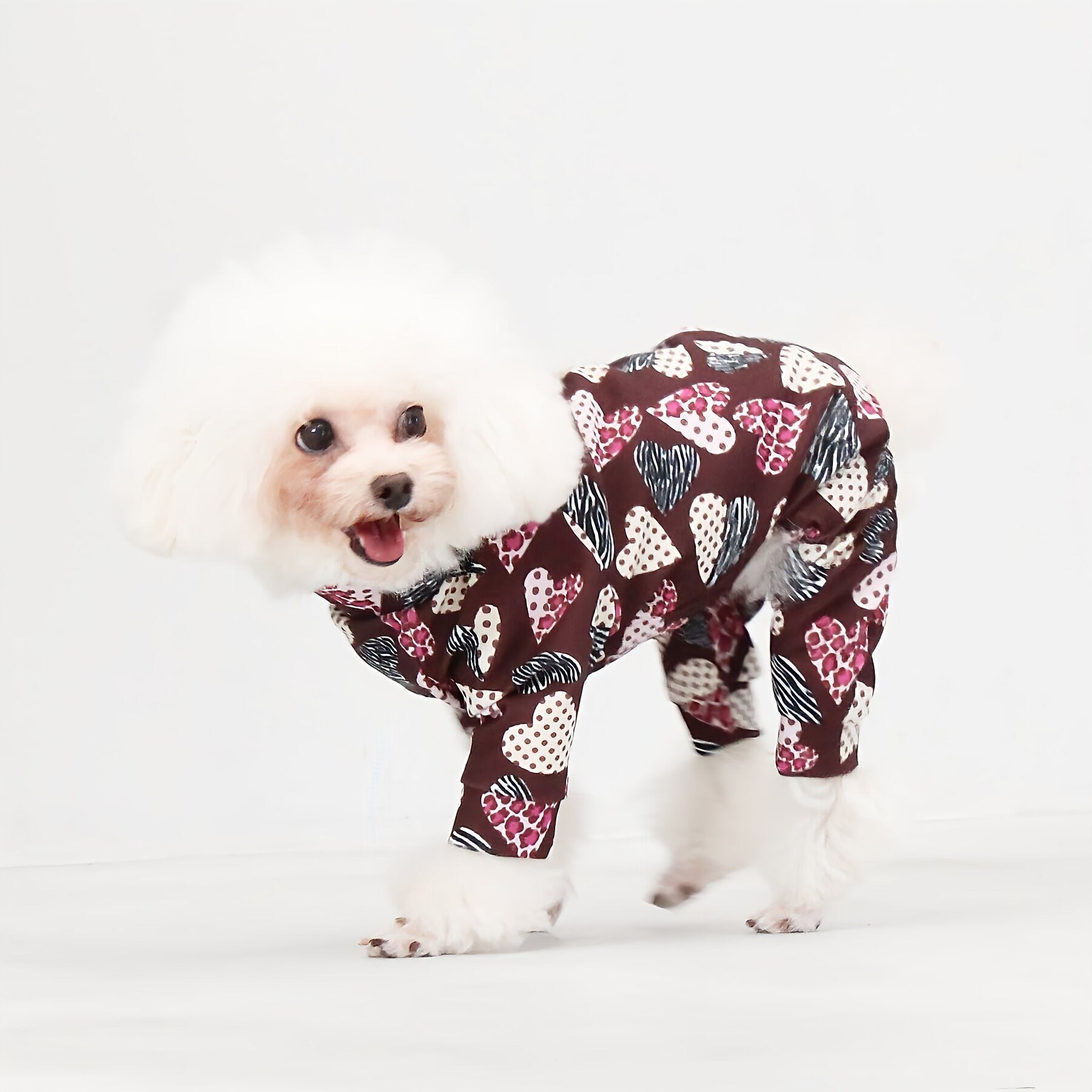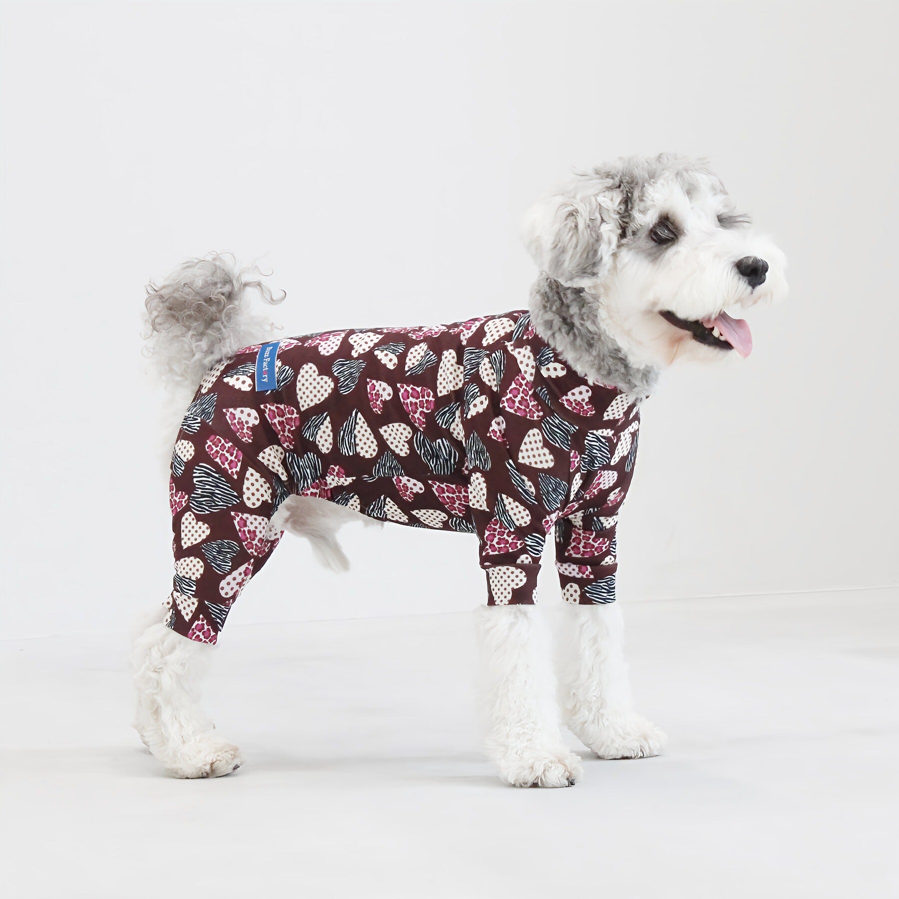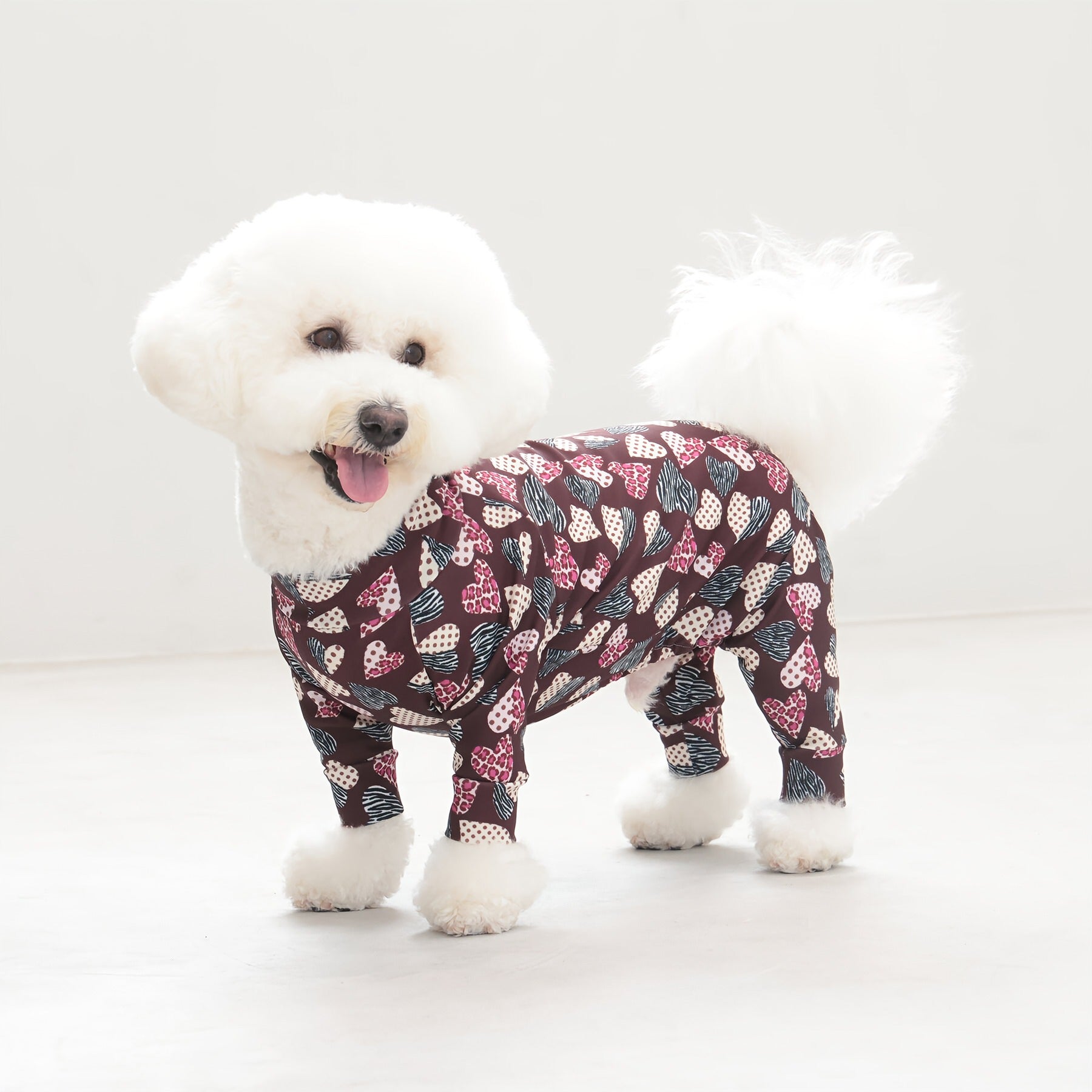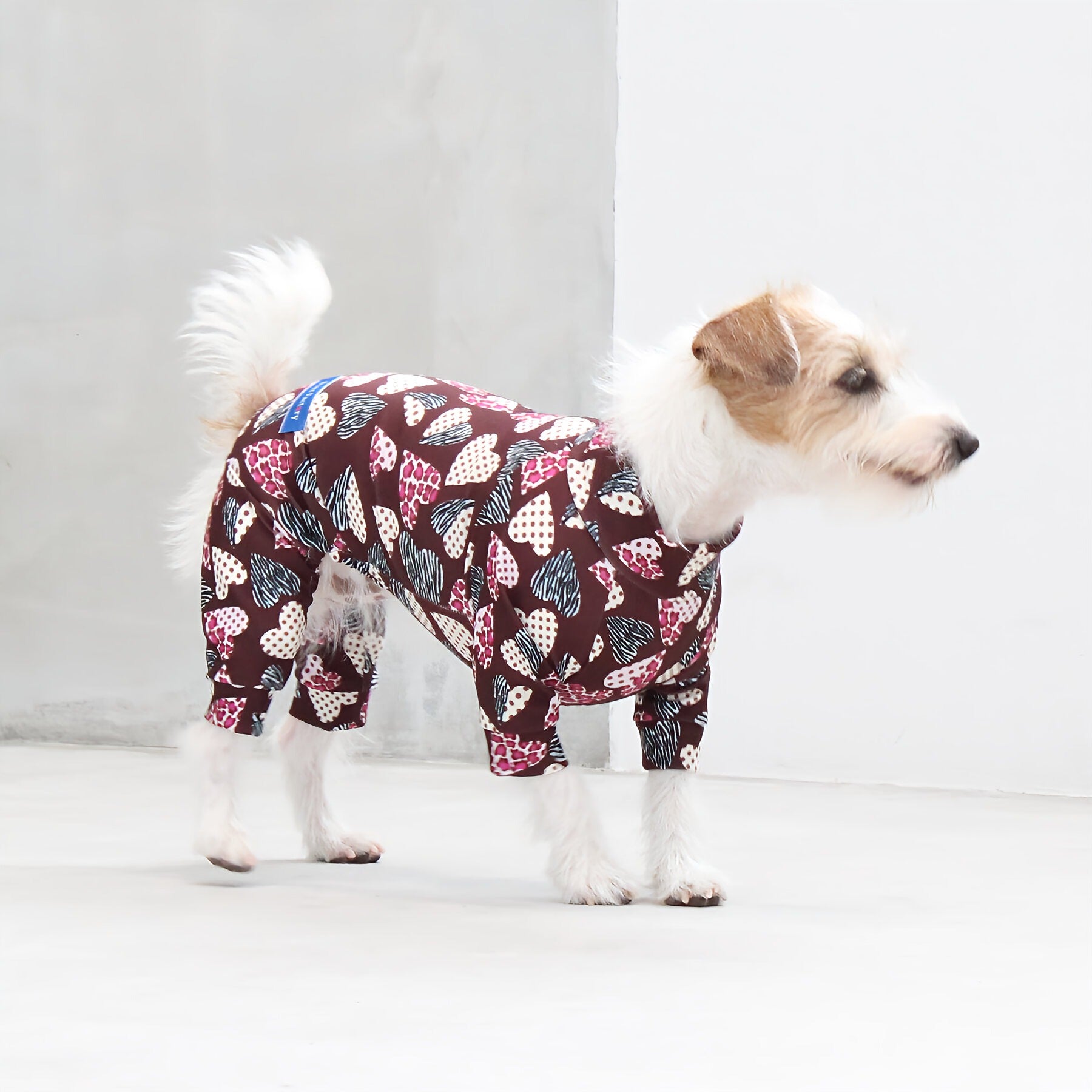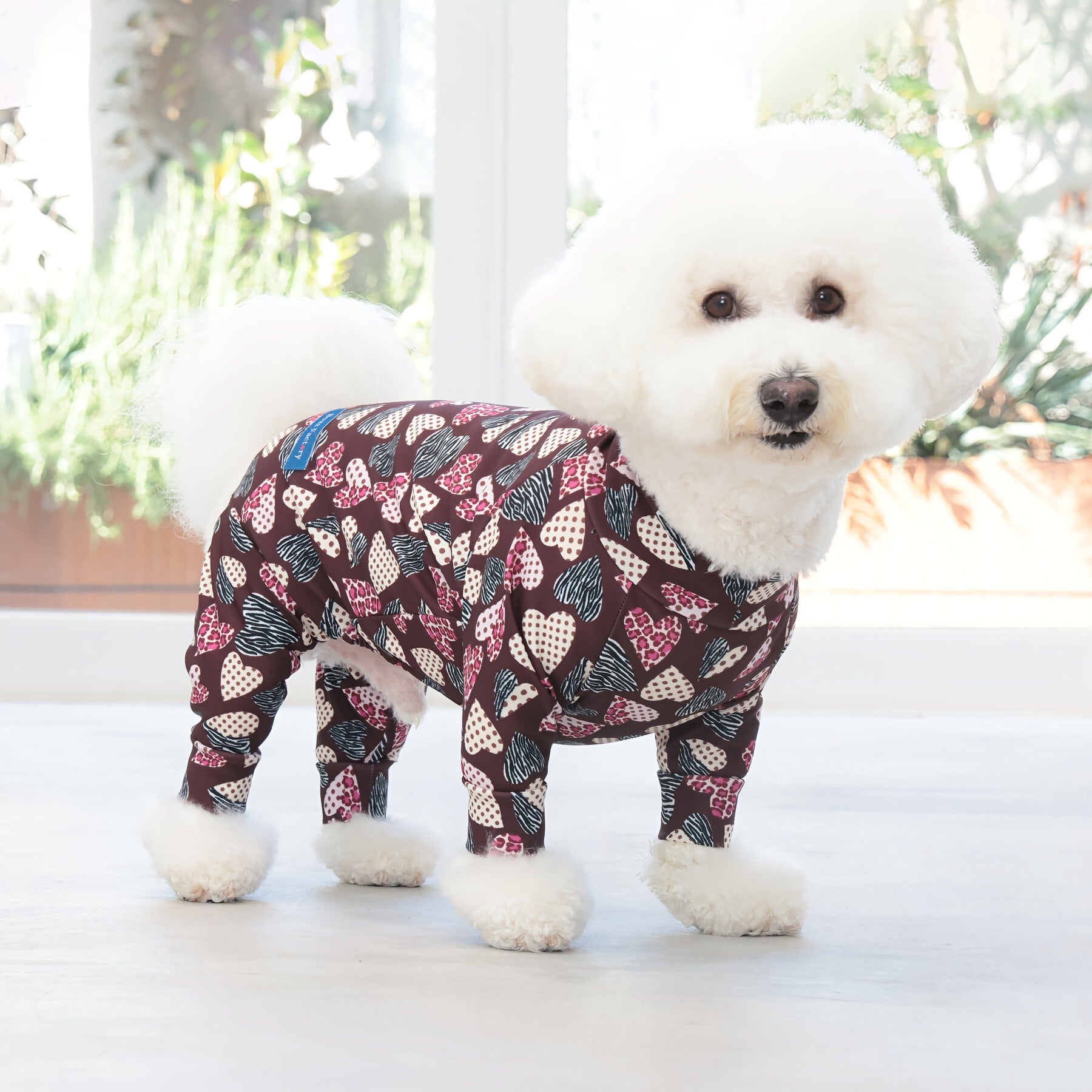 ※サイズによって値段が異なりますので、サイズをご選択していただき、値段をご確認ください。商品説明クールと可愛らしさ、両立が難しい2つの雰囲気を表現したアニマルハート。レオパードやジブラをハートやドットで可愛しく仕上げております。ロンパースでは珍しい、黒色を地色に採用していることもこだわりポイントのひとつです。こちらのカラフルロンパース シリーズは伸縮性や形態安定にとても優れており、オールシーズンに活躍。また、アウトドアやお出かけに最適なアイテムで、飼い主の方々にとっては日本製・洗濯可能なので安心かつイージーケアな商品です。わんちゃん用のウェアには散歩中やドッグランでの防汚効果や野生のノミ・ダニ予防、屋内や車内での抜け毛予防、手術や治療後の舐め防止など、多くの利点がございます。【モデル】トイプードル(Lサイズ着用)【モデル】ビジョンフリーゼ(Lサイズ着用)【モデル】ジャックラッセルテリア(LLサイズ着用)【モデル】ミニチュアシュナウザー(LLサイズ着用)【モデル】シェットランドシープドッグ(4Lサイズ着用)【モデル】スタンダードプードル(※0歳)(4Lサイズ着用)【モデル】フレンチブルドッグ(FPGサイズ着用)※新色、「チョコ」より撮影モデルが変更いたします。【モデル①】チワワ(体重:2kg、着用:Mサイズ)【モデル②】ティーカップ・プードル(体重:1.5kg、着用:Mサイズ)【モデル③】ジャック・ラッセル・テリア(体重:6kg、着用:Lサイズ)【モデル④】トイ・プードル(体重:3kg、着用:Lサイズ)【モデル⑤】ミニチュア・シュナウザー(体重:9kg、着用:LLサイズ)【モデル⑥】ビション・フリーゼ(体重:9.5kg、着用:3Lサイズ)【モデル⑦】シベリアン・ハスキー(体重:22kg、着用:5Lサイズ)【モデル⑧】イングリッシュ・ゴールデン・レトリーバー(体重:28kg、着用:6Lサイズ)【モデル⑨】フレンチ・ブルドッグ(体重:11.8kg、着用:FPGサイズ)サイズS, M, L, 2L(LL), 3L, 4L, 5L, 6L, DFS, DFM, FPG※サイズ測定はサイズ表をご覧ください。素材 / 仕様ポリエステル 83%、ポリウレタン 17%ロンパースタイプ(4つ足用)素材感生地の厚さ:普通透け感:透けない伸縮性:あり裏地:なしポケット:なし内容量本製品×1原産国日本洗濯絵表示洗濯可能本製品のお取り扱い-
