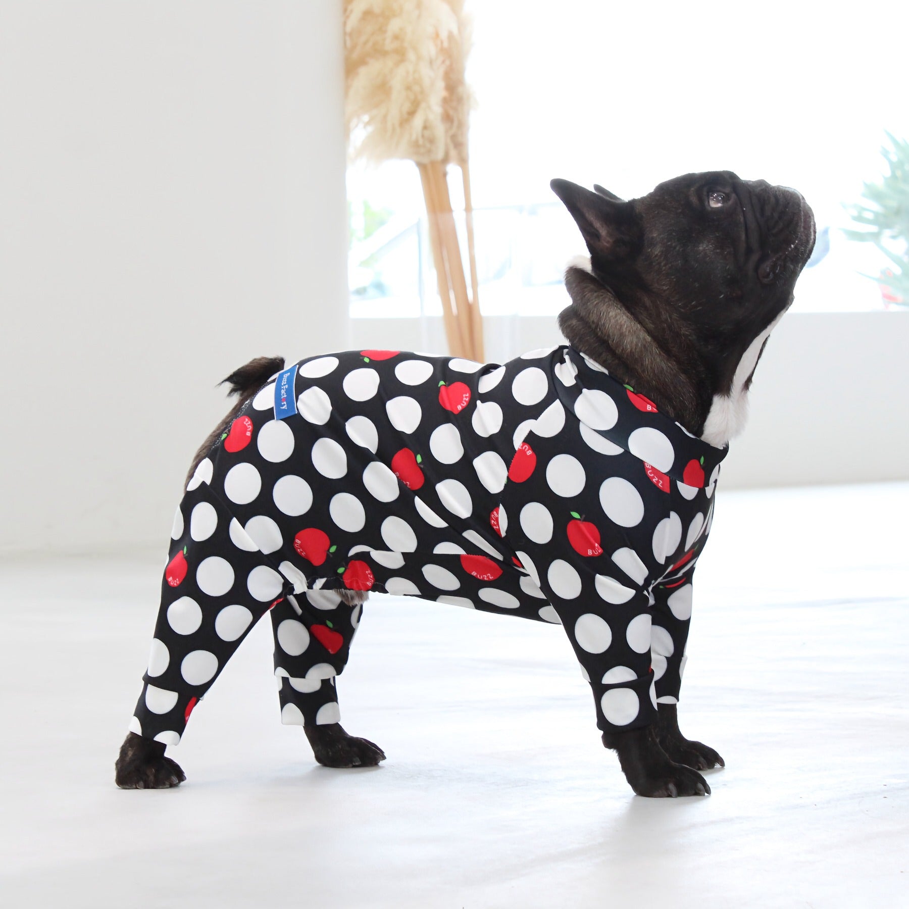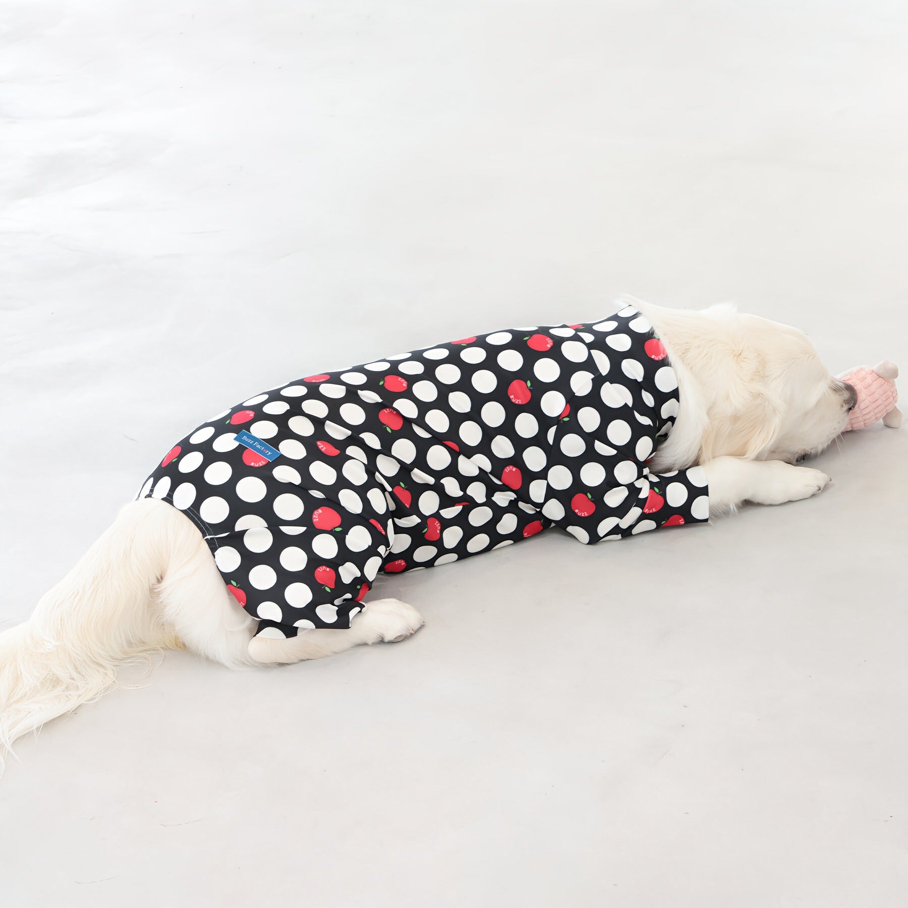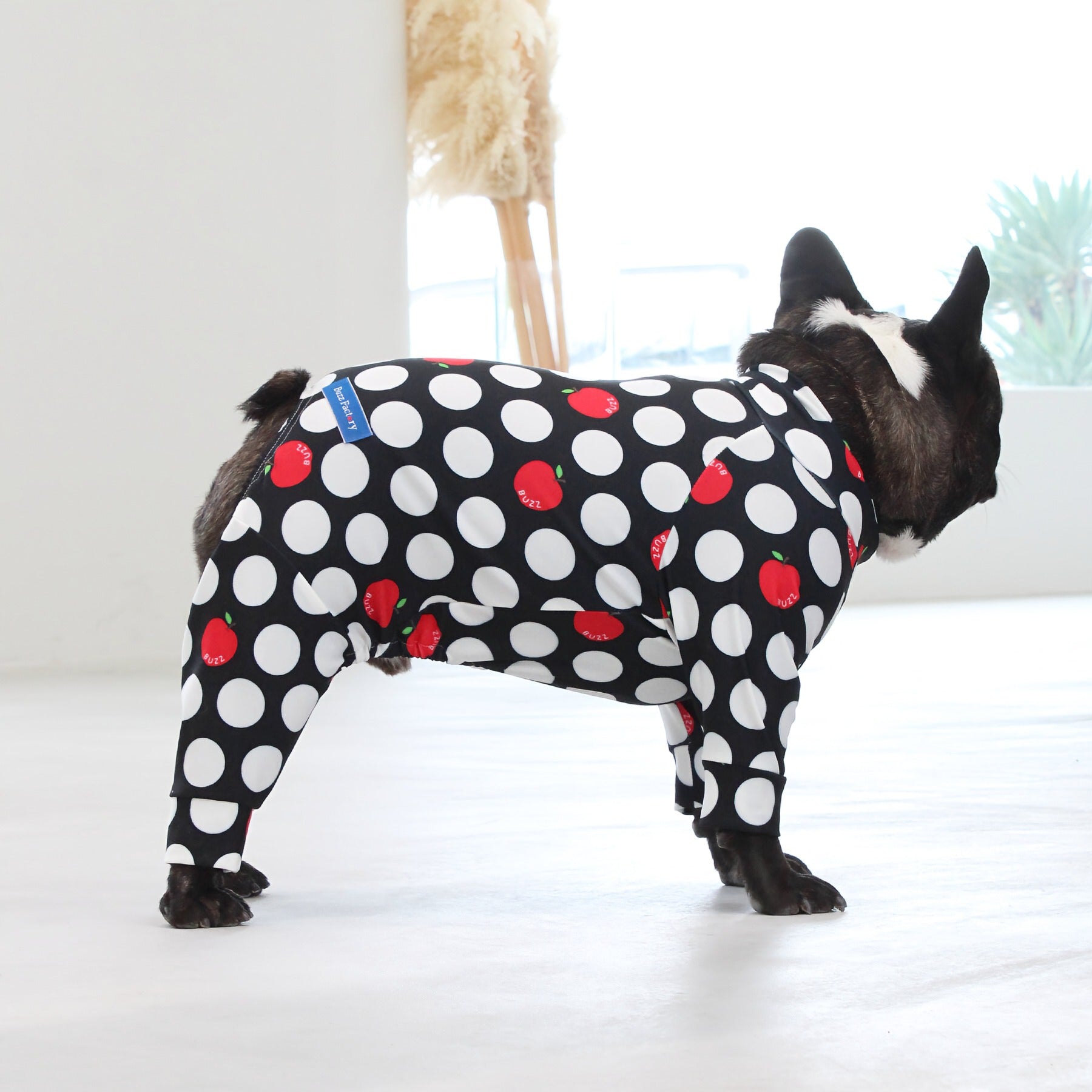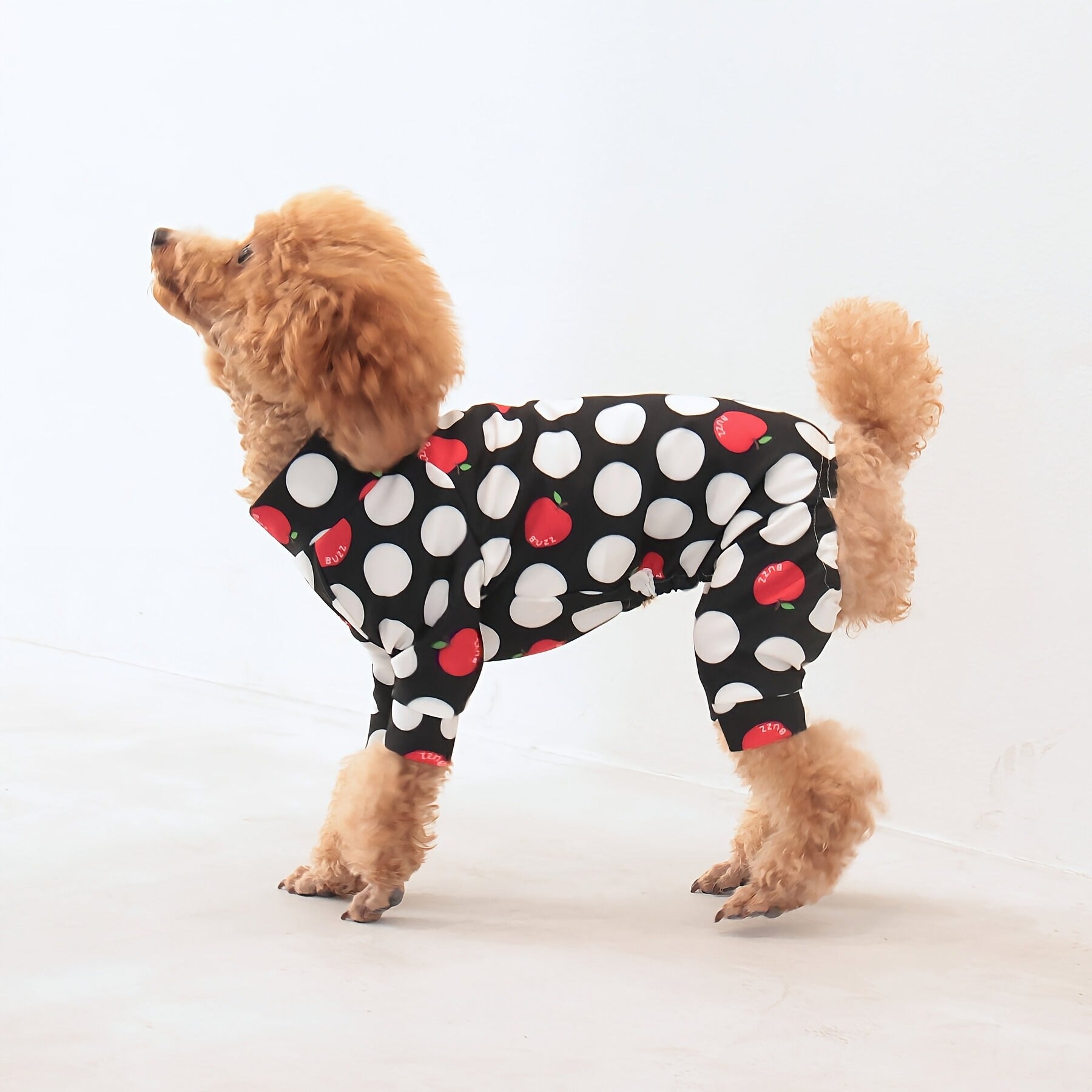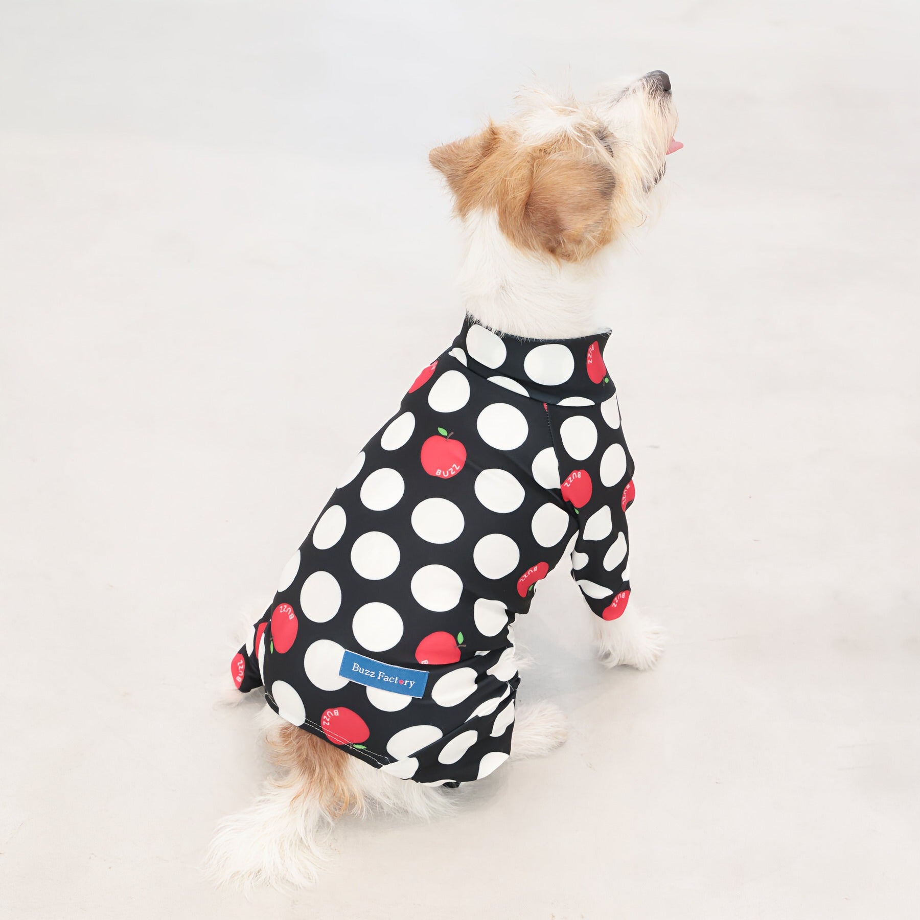 ※サイズによって値段が異なりますので、サイズをご選択していただき、値段をご確認ください。商品説明Buzz Factoryから、小さなりんごをドットに見立てた、可愛らしくもどこかレトロな新デザイン、「アップルドット」が登場しました。ブラックをベースに、落ち着いたトーンの中にレッドがアクセントとして映える一枚。ドットのように散りばめられたアップルが、クラシカルで上品な印象を演出します。【モデル①】チワワ(体重:3kg、着用:Mサイズ)【モデル②】ティーカップ・プードル(体重:1.5kg、着用:Mサイズ)【モデル③】ジャック・ラッセル・テリア(体重:6kg、着用:Lサイズ)【モデル④】トイ・プードル(体重:3kg、着用:Lサイズ)【モデル⑤】ミニチュア・シュナウザー(体重:9kg、着用:LLサイズ)【モデル⑥】ビション・フリーゼ(体重:9.5kg、着用:3Lサイズ)【モデル⑦】シベリアン・ハスキー(体重:22kg、着用:5Lサイズ)【モデル⑧】スタンダード・プードル(体重:17kg、着用:5Lサイズ)【モデル⑨】イングリッシュ・ゴールデン・レトリーバー(体重:28kg、着用:6Lサイズ)【モデル⑩】ゴールデン・レトリーバー(体重:32kg、着用:6Lサイズ)【モデル11】フレンチ・ブルドッグ(体重:11.8kg、着用:FPGサイズ)生地の特徴伸縮性や形態安定にとても優れており、アウトドアやお出かけにオールシーズンで活躍してくれます。日本製・洗濯可能なので安心かつイージーケアな素材感になります。ロンパース / Rompers とはわんちゃん用の専用ウェアとして、散歩中やドッグランでの防汚効果や野生のノミ・ダニ予防、屋内や車内での抜け毛予防、手術や治療後の舐め防止など、多くの利点がございます。サイズ標準サイズ:S、M、L、LL、3L、4L、5L、6Lフレンチ・パグサイズ:FPGダックスフンド:DFS(Sサイズ)、DFM(Mサイズ)※サイズ測定はサイズ表をご覧ください。素材 / 仕様ポリエステル 83%、ポリウレタン 17%ロンパースタイプ(4つ足用)素材感生地の厚さ:普通透け感:透けない(白地のみ:やや透ける)伸縮性:あり裏地:なしポケット:なし内容量本製品×1原産国日本洗濯絵表示洗濯可能本製品のお取り扱い-