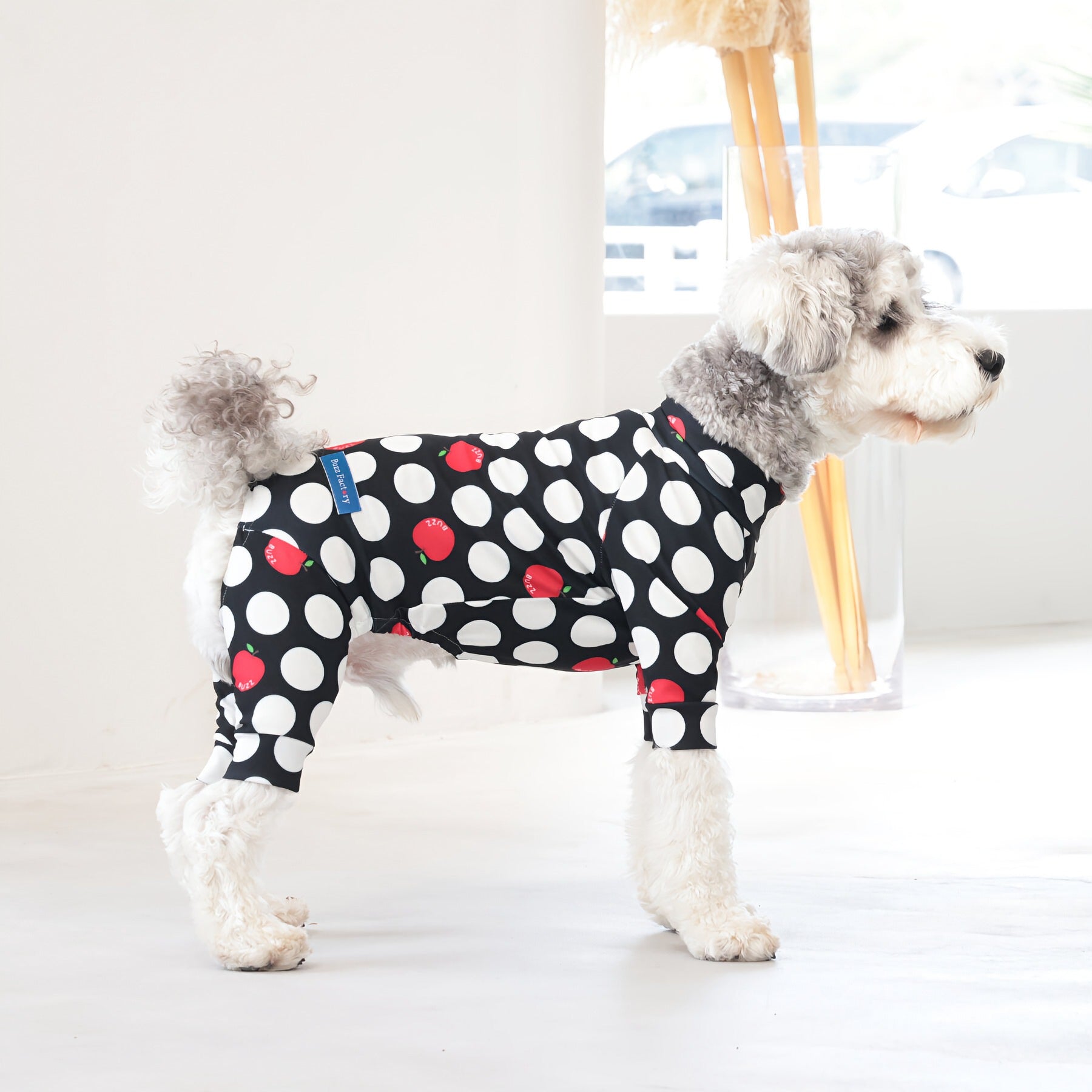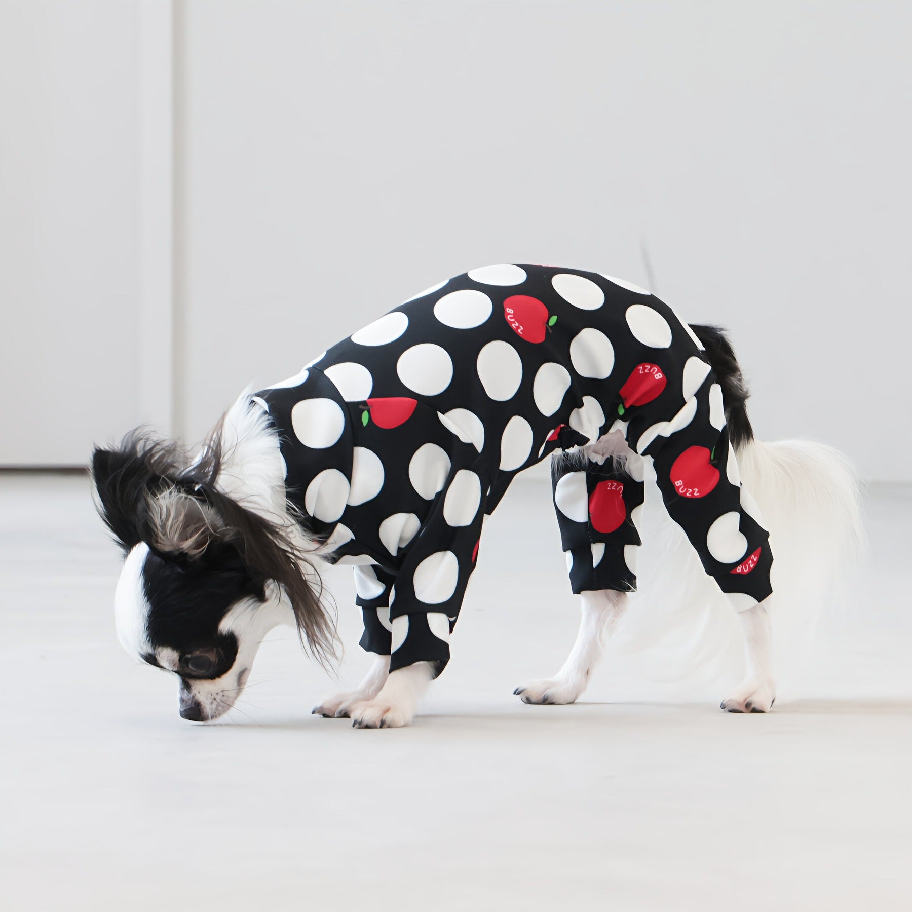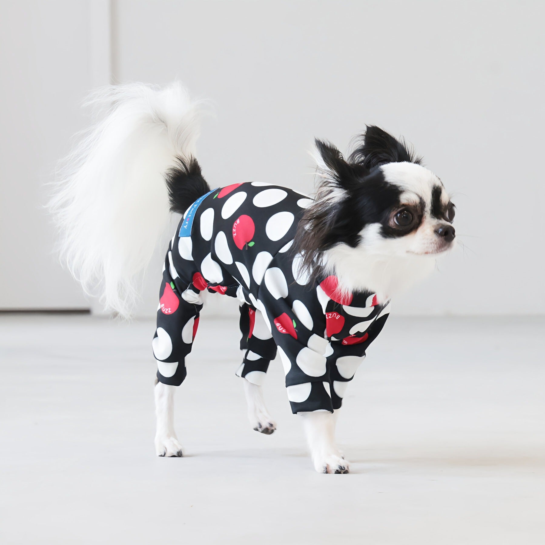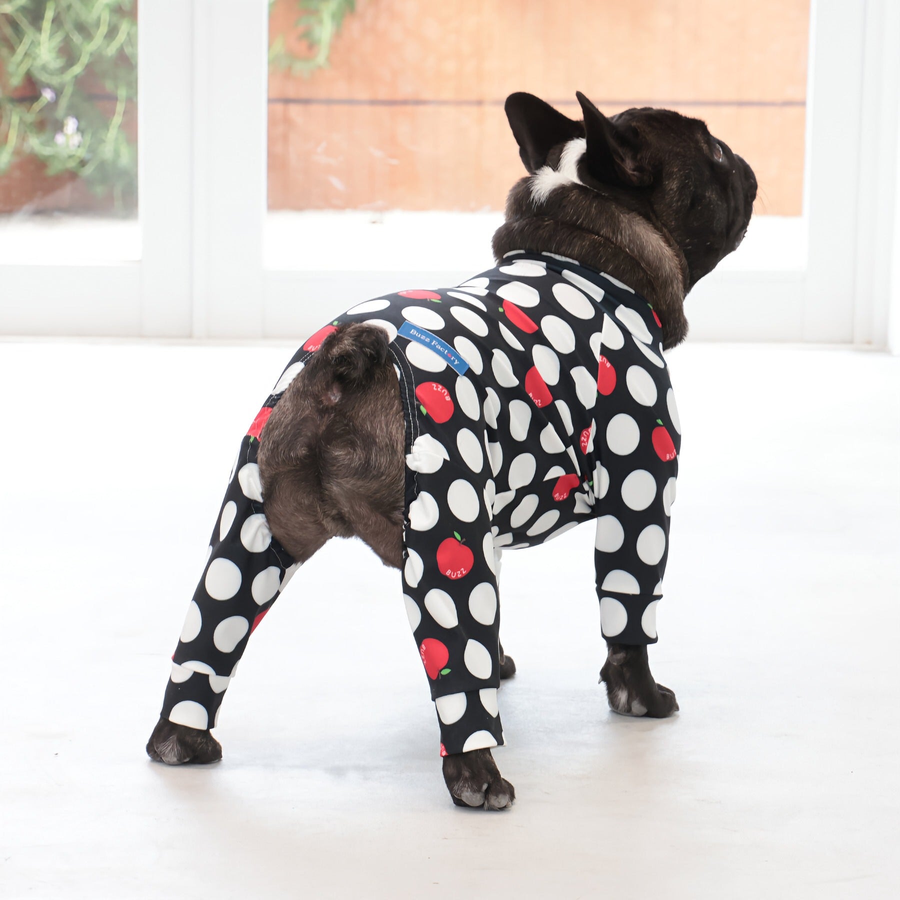 ※サイズによって値段が異なりますので、サイズをご選択していただき、値段をご確認ください。商品説明Buzz Factoryから、小さなりんごをドットに見立てた、可愛らしくもどこかレトロな新デザイン、「アップルドット」が登場しました。ブラックをベースに、落ち着いたトーンの中にレッドがアクセントとして映える一枚。ドットのように散りばめられたアップルが、クラシカルで上品な印象を演出します。【モデル①】チワワ(体重:3kg、着用:Mサイズ)【モデル②】ティーカップ・プードル(体重:1.5kg、着用:Mサイズ)【モデル③】ジャック・ラッセル・テリア(体重:6kg、着用:Lサイズ)【モデル④】トイ・プードル(体重:3kg、着用:Lサイズ)【モデル⑤】ミニチュア・シュナウザー(体重:9kg、着用:LLサイズ)【モデル⑥】ビション・フリーゼ(体重:9.5kg、着用:3Lサイズ)【モデル⑦】シベリアン・ハスキー(体重:22kg、着用:5Lサイズ)【モデル⑧】スタンダード・プードル(体重:17kg、着用:5Lサイズ)【モデル⑨】イングリッシュ・ゴールデン・レトリーバー(体重:28kg、着用:6Lサイズ)【モデル⑩】ゴールデン・レトリーバー(体重:32kg、着用:6Lサイズ)【モデル11】フレンチ・ブルドッグ(体重:11.8kg、着用:FPGサイズ)生地の特徴伸縮性や形態安定にとても優れており、アウトドアやお出かけにオールシーズンで活躍してくれます。日本製・洗濯可能なので安心かつイージーケアな素材感になります。ロンパース / Rompers とはわんちゃん用の専用ウェアとして、散歩中やドッグランでの防汚効果や野生のノミ・ダニ予防、屋内や車内での抜け毛予防、手術や治療後の舐め防止など、多くの利点がございます。サイズ標準サイズ:S、M、L、LL、3L、4L、5L、6Lフレンチ・パグサイズ:FPGダックスフンド:DFS(Sサイズ)、DFM(Mサイズ)※サイズ測定はサイズ表をご覧ください。素材 / 仕様ポリエステル 83%、ポリウレタン 17%ロンパースタイプ(4つ足用)素材感生地の厚さ:普通透け感:透けない(白地のみ:やや透ける)伸縮性:あり裏地:なしポケット:なし内容量本製品×1原産国日本洗濯絵表示洗濯可能本製品のお取り扱い-