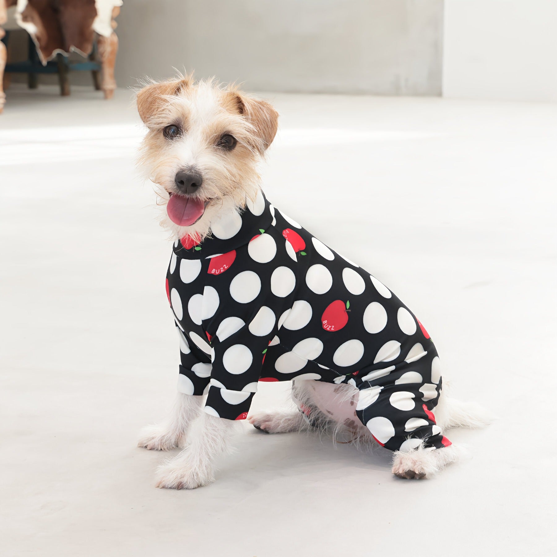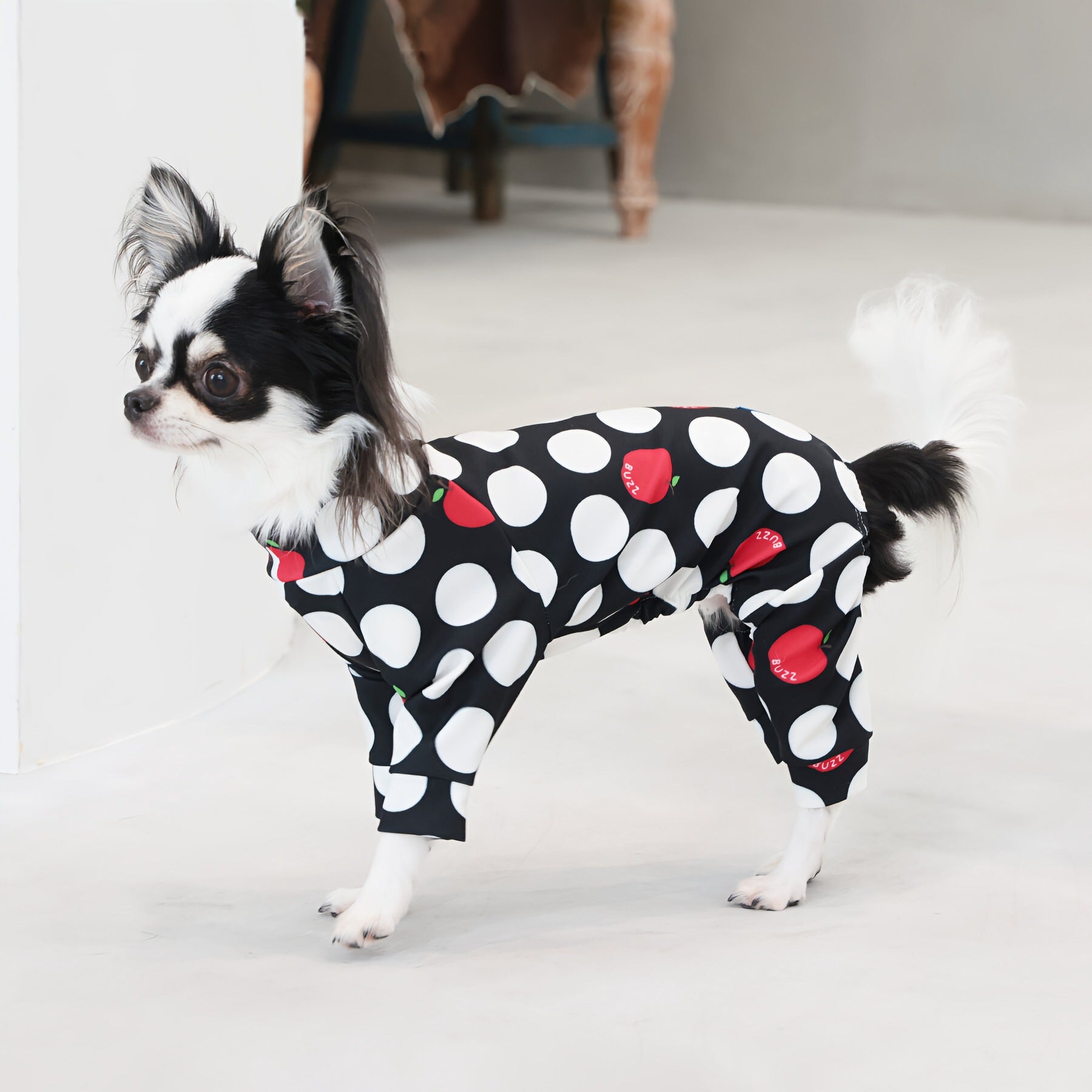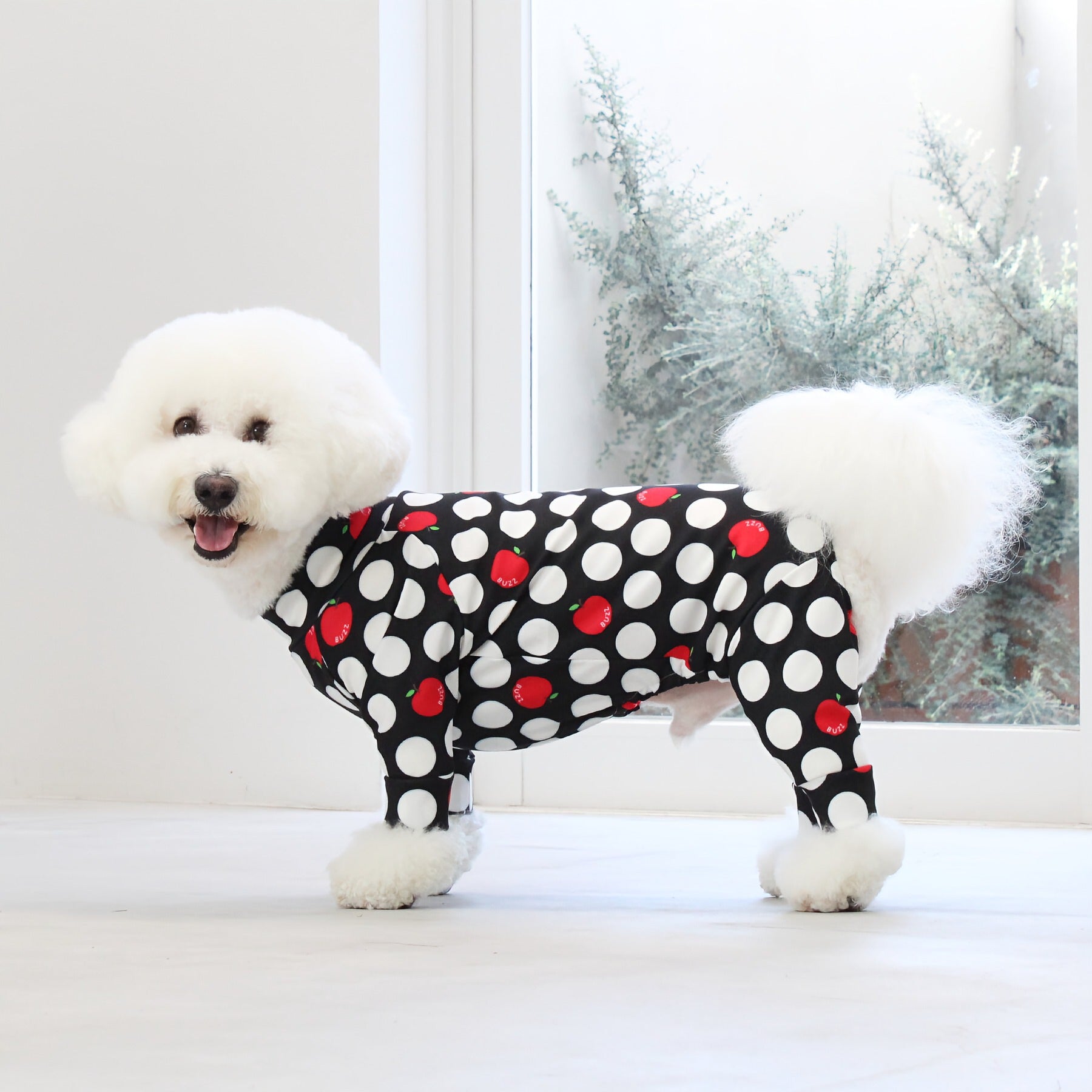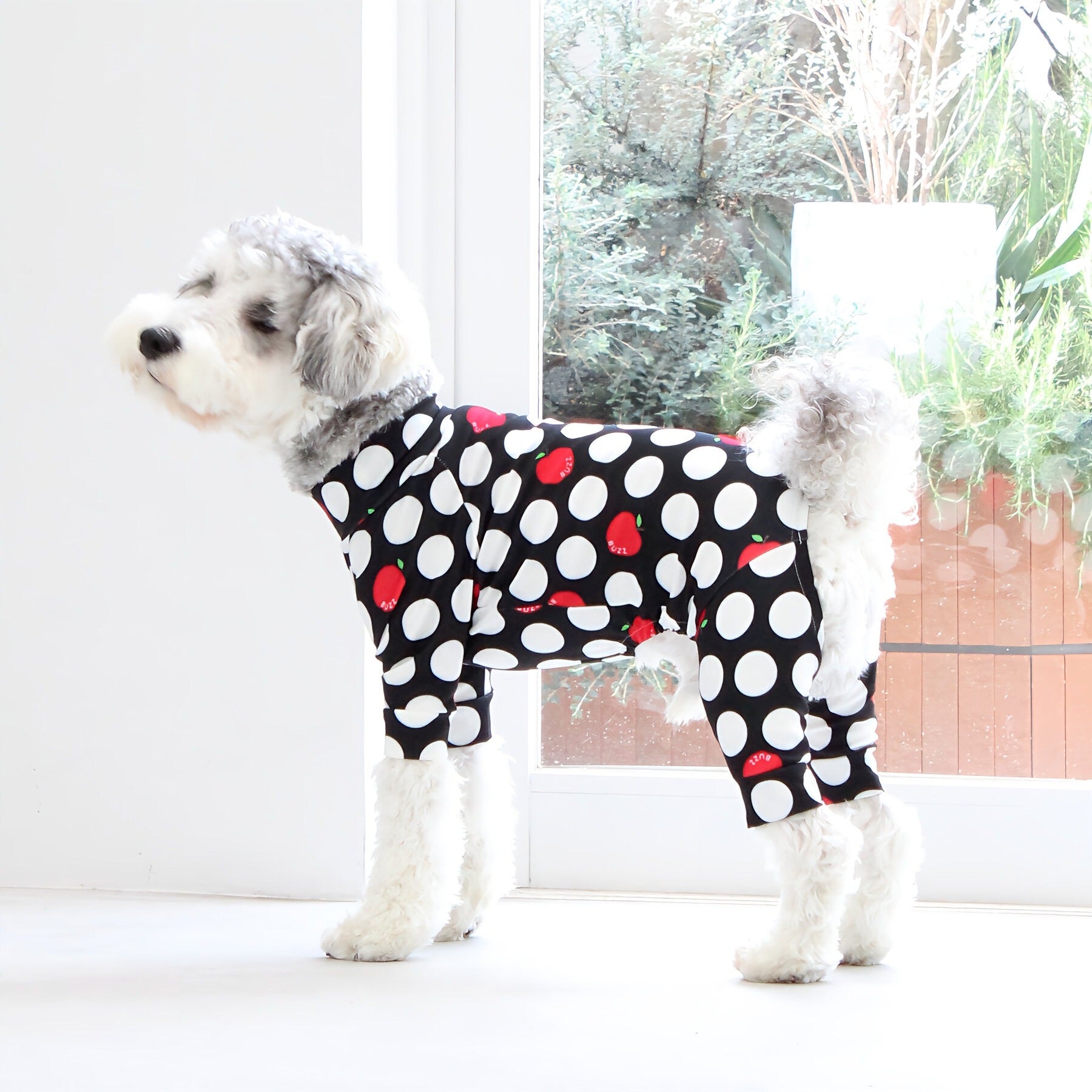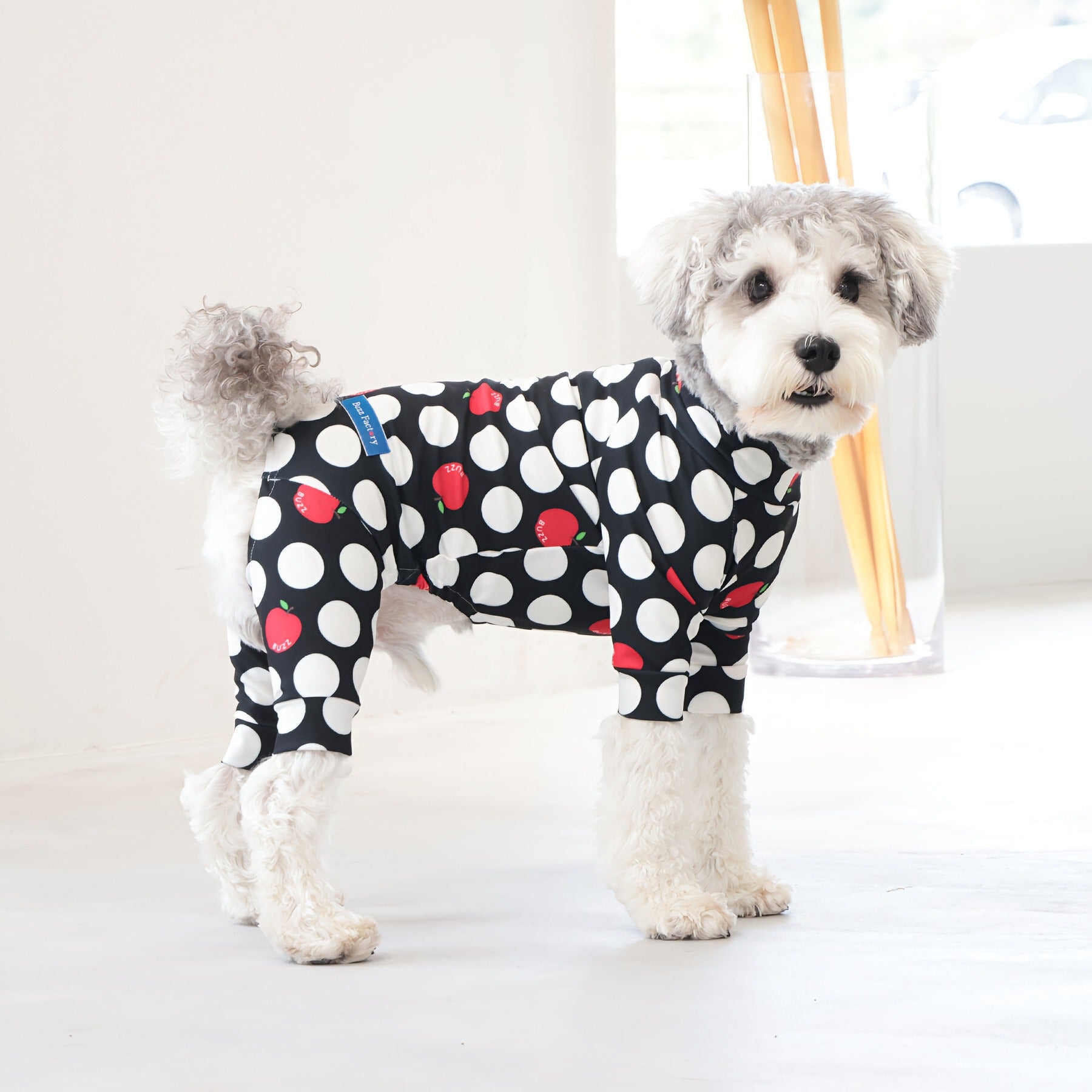 ※サイズによって値段が異なりますので、サイズをご選択していただき、値段をご確認ください。商品説明Buzz Factoryから、小さなりんごをドットに見立てた、可愛らしくもどこかレトロな新デザイン、「アップルドット」が登場しました。ブラックをベースに、落ち着いたトーンの中にレッドがアクセントとして映える一枚。ドットのように散りばめられたアップルが、クラシカルで上品な印象を演出します。【モデル①】チワワ(体重:3kg、着用:Mサイズ)【モデル②】ティーカップ・プードル(体重:1.5kg、着用:Mサイズ)【モデル③】ジャック・ラッセル・テリア(体重:6kg、着用:Lサイズ)【モデル④】トイ・プードル(体重:3kg、着用:Lサイズ)【モデル⑤】ミニチュア・シュナウザー(体重:9kg、着用:LLサイズ)【モデル⑥】ビション・フリーゼ(体重:9.5kg、着用:3Lサイズ)【モデル⑦】シベリアン・ハスキー(体重:22kg、着用:5Lサイズ)【モデル⑧】スタンダード・プードル(体重:17kg、着用:5Lサイズ)【モデル⑨】イングリッシュ・ゴールデン・レトリーバー(体重:28kg、着用:6Lサイズ)【モデル⑩】ゴールデン・レトリーバー(体重:32kg、着用:6Lサイズ)【モデル11】フレンチ・ブルドッグ(体重:11.8kg、着用:FPGサイズ)生地の特徴伸縮性や形態安定にとても優れており、アウトドアやお出かけにオールシーズンで活躍してくれます。日本製・洗濯可能なので安心かつイージーケアな素材感になります。ロンパース / Rompers とはわんちゃん用の専用ウェアとして、散歩中やドッグランでの防汚効果や野生のノミ・ダニ予防、屋内や車内での抜け毛予防、手術や治療後の舐め防止など、多くの利点がございます。サイズ標準サイズ:S、M、L、LL、3L、4L、5L、6Lフレンチ・パグサイズ:FPGダックスフンド:DFS(Sサイズ)、DFM(Mサイズ)※サイズ測定はサイズ表をご覧ください。素材 / 仕様ポリエステル 83%、ポリウレタン 17%ロンパースタイプ(4つ足用)素材感生地の厚さ:普通透け感:透けない(白地のみ:やや透ける)伸縮性:あり裏地:なしポケット:なし内容量本製品×1原産国日本洗濯絵表示洗濯可能本製品のお取り扱い-