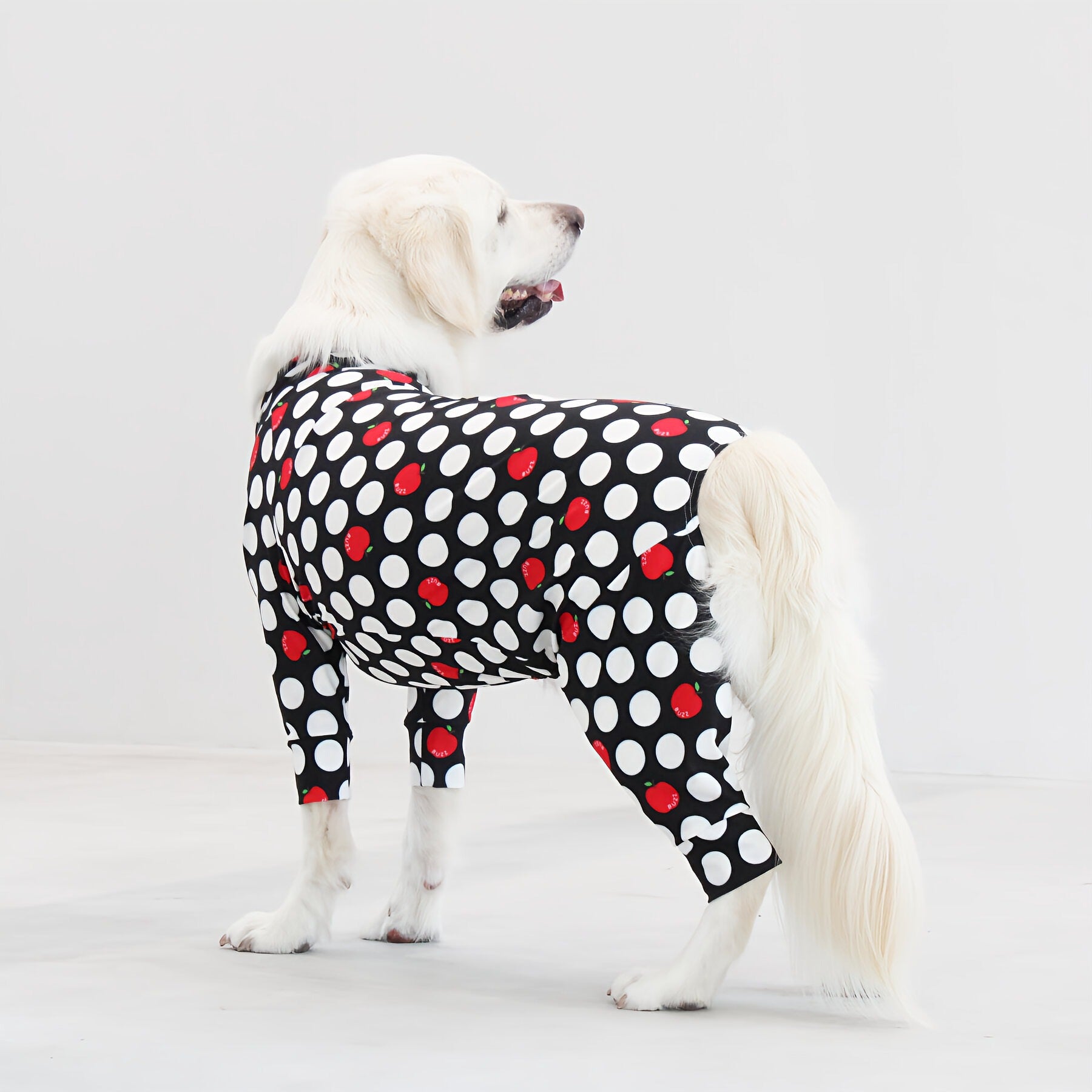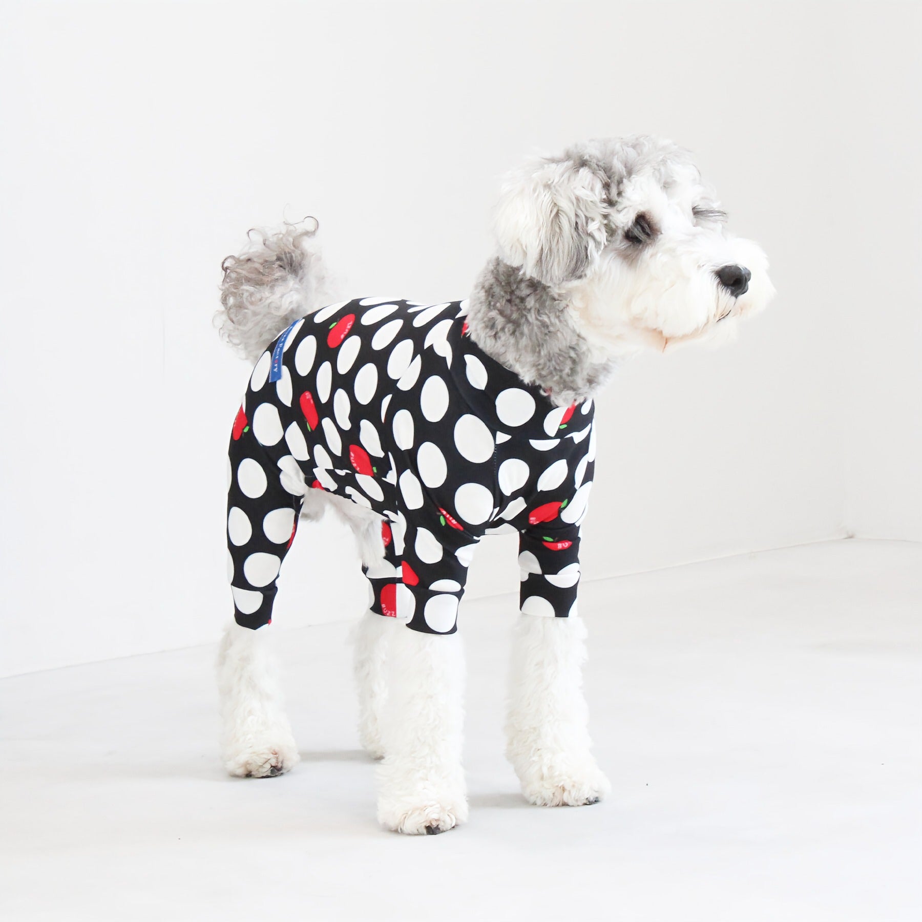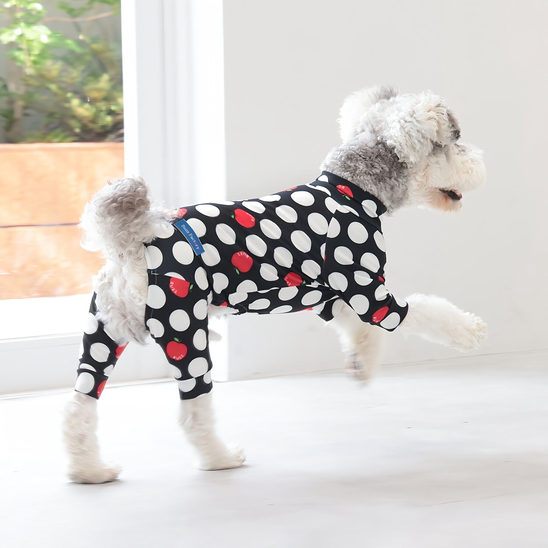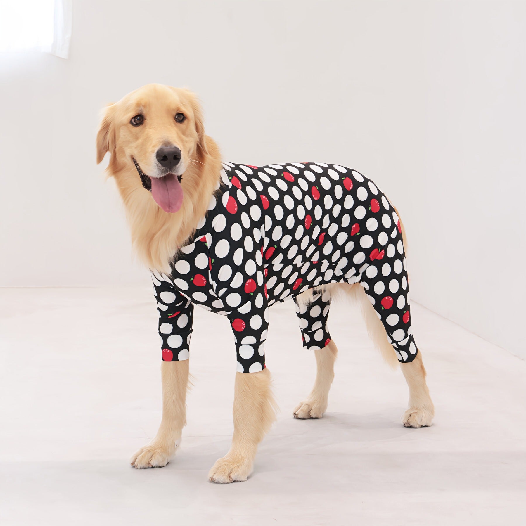 ※サイズによって値段が異なりますので、サイズをご選択していただき、値段をご確認ください。商品説明Buzz Factoryから、小さなりんごをドットに見立てた、可愛らしくもどこかレトロな新デザイン、「アップルドット」が登場しました。ブラックをベースに、落ち着いたトーンの中にレッドがアクセントとして映える一枚。ドットのように散りばめられたアップルが、クラシカルで上品な印象を演出します。【モデル①】チワワ(体重:3kg、着用:Mサイズ)【モデル②】ティーカップ・プードル(体重:1.5kg、着用:Mサイズ)【モデル③】ジャック・ラッセル・テリア(体重:6kg、着用:Lサイズ)【モデル④】トイ・プードル(体重:3kg、着用:Lサイズ)【モデル⑤】ミニチュア・シュナウザー(体重:9kg、着用:LLサイズ)【モデル⑥】ビション・フリーゼ(体重:9.5kg、着用:3Lサイズ)【モデル⑦】シベリアン・ハスキー(体重:22kg、着用:5Lサイズ)【モデル⑧】スタンダード・プードル(体重:17kg、着用:5Lサイズ)【モデル⑨】イングリッシュ・ゴールデン・レトリーバー(体重:28kg、着用:6Lサイズ)【モデル⑩】ゴールデン・レトリーバー(体重:32kg、着用:6Lサイズ)【モデル11】フレンチ・ブルドッグ(体重:11.8kg、着用:FPGサイズ)生地の特徴伸縮性や形態安定にとても優れており、アウトドアやお出かけにオールシーズンで活躍してくれます。日本製・洗濯可能なので安心かつイージーケアな素材感になります。ロンパース / Rompers とはわんちゃん用の専用ウェアとして、散歩中やドッグランでの防汚効果や野生のノミ・ダニ予防、屋内や車内での抜け毛予防、手術や治療後の舐め防止など、多くの利点がございます。サイズ標準サイズ:S、M、L、LL、3L、4L、5L、6Lフレンチ・パグサイズ:FPGダックスフンド:DFS(Sサイズ)、DFM(Mサイズ)※サイズ測定はサイズ表をご覧ください。素材 / 仕様ポリエステル 83%、ポリウレタン 17%ロンパースタイプ(4つ足用)素材感生地の厚さ:普通透け感:透けない(白地のみ:やや透ける)伸縮性:あり裏地:なしポケット:なし内容量本製品×1原産国日本洗濯絵表示洗濯可能本製品のお取り扱い-