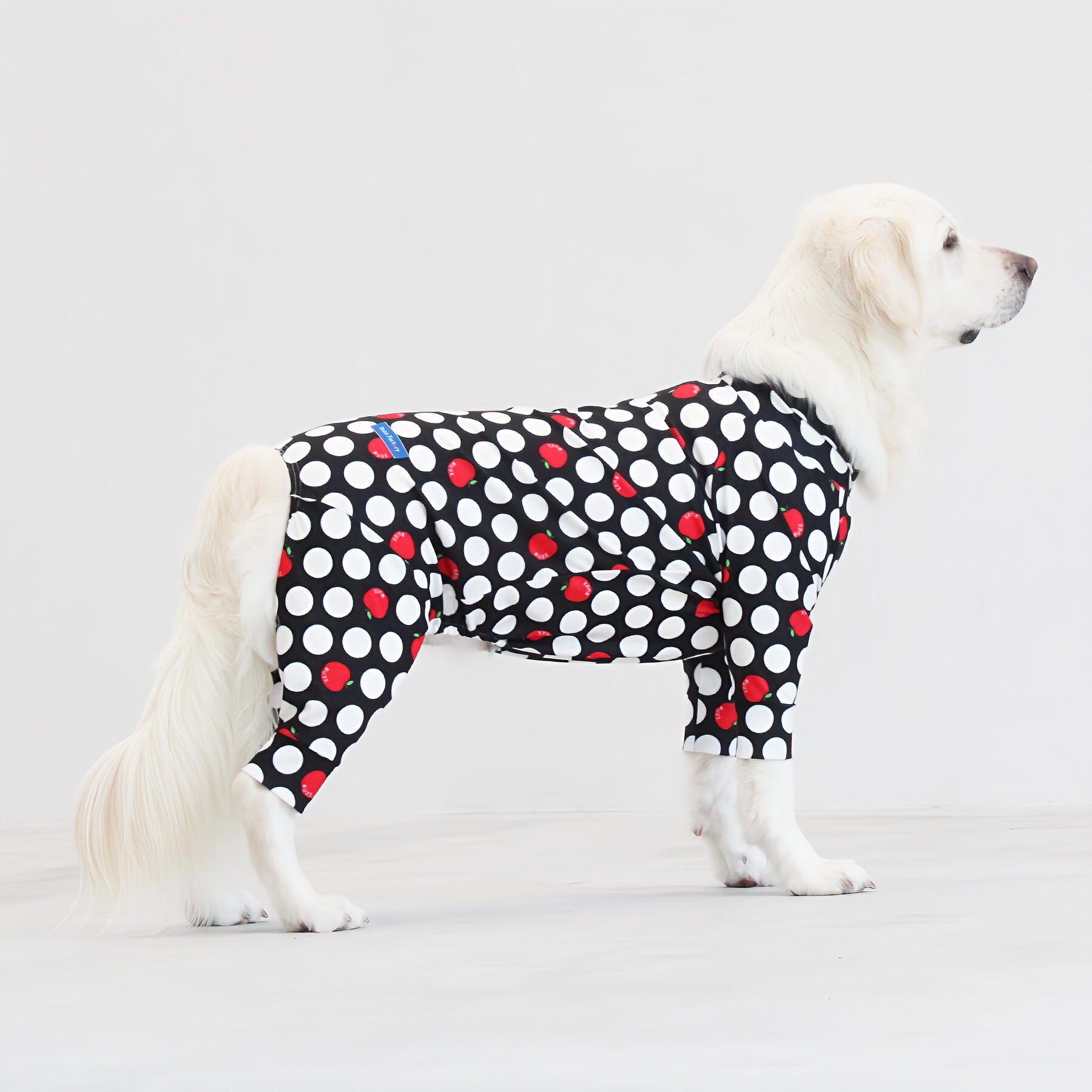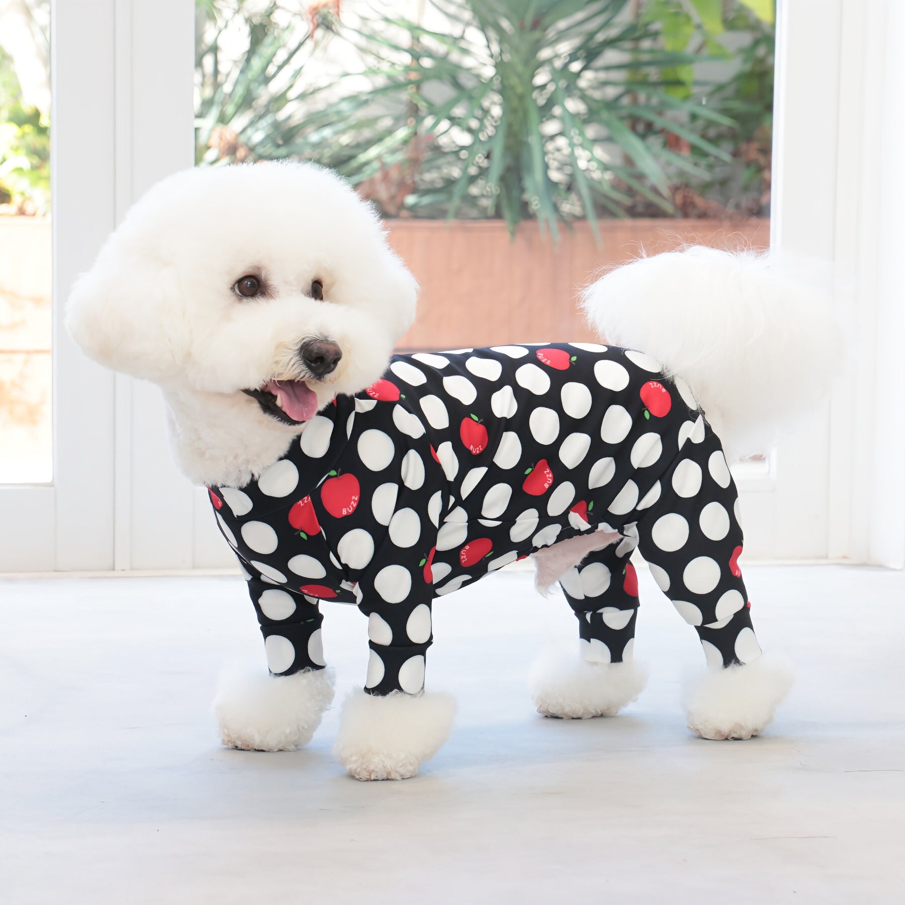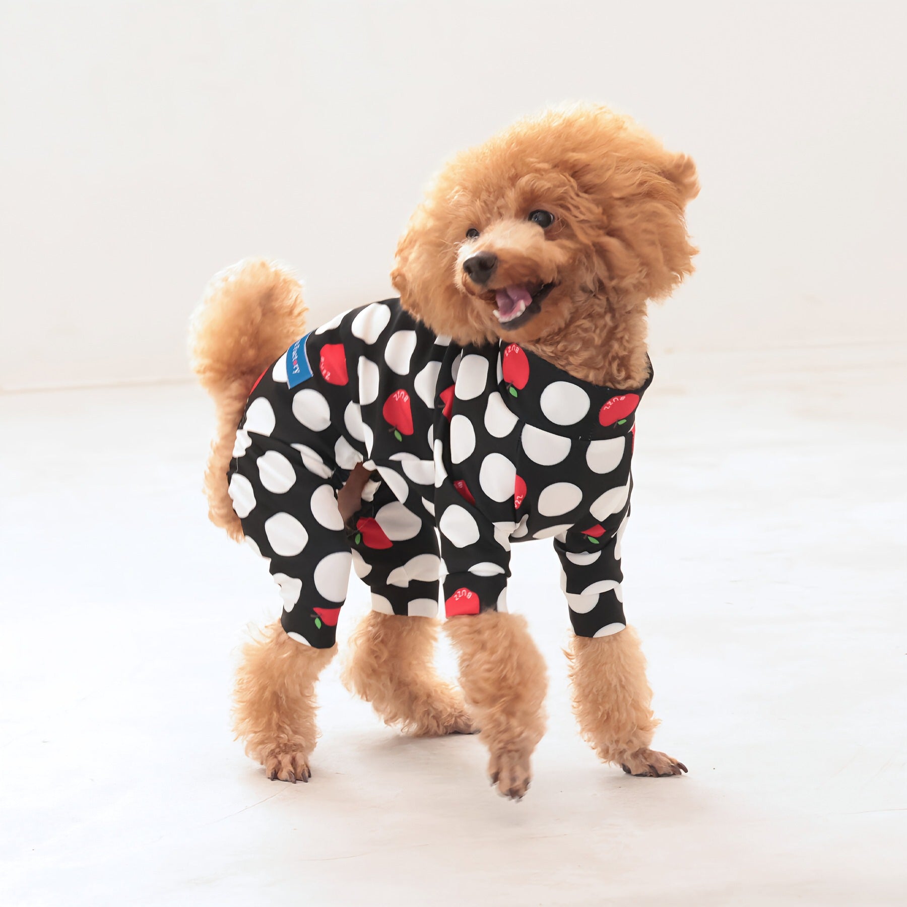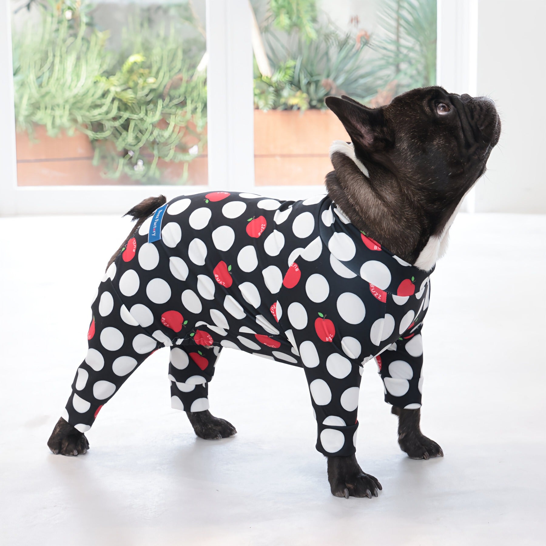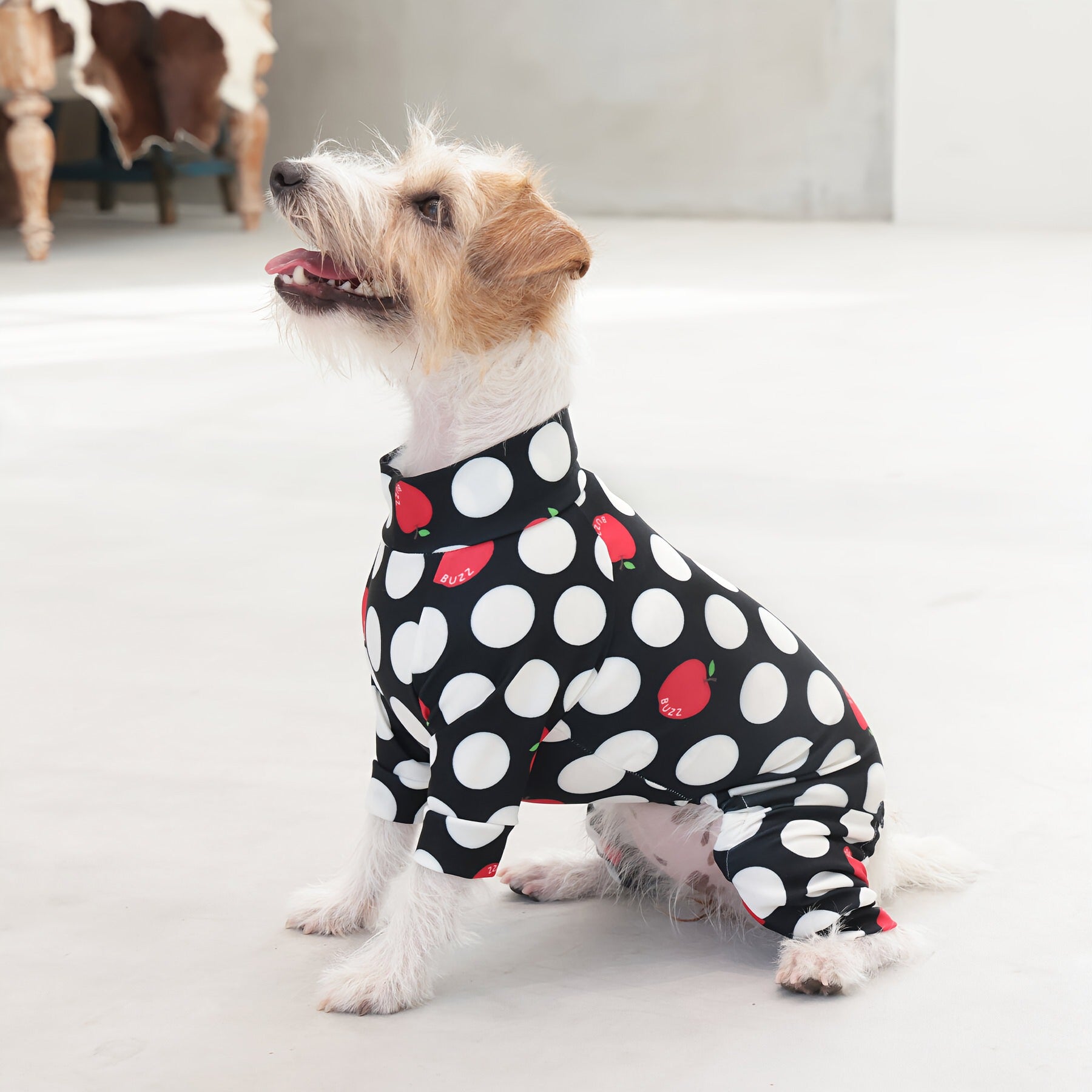 ※サイズによって値段が異なりますので、サイズをご選択していただき、値段をご確認ください。商品説明Buzz Factoryから、小さなりんごをドットに見立てた、可愛らしくもどこかレトロな新デザイン、「アップルドット」が登場しました。ブラックをベースに、落ち着いたトーンの中にレッドがアクセントとして映える一枚。ドットのように散りばめられたアップルが、クラシカルで上品な印象を演出します。【モデル①】チワワ(体重:3kg、着用:Mサイズ)【モデル②】ティーカップ・プードル(体重:1.5kg、着用:Mサイズ)【モデル③】ジャック・ラッセル・テリア(体重:6kg、着用:Lサイズ)【モデル④】トイ・プードル(体重:3kg、着用:Lサイズ)【モデル⑤】ミニチュア・シュナウザー(体重:9kg、着用:LLサイズ)【モデル⑥】ビション・フリーゼ(体重:9.5kg、着用:3Lサイズ)【モデル⑦】シベリアン・ハスキー(体重:22kg、着用:5Lサイズ)【モデル⑧】スタンダード・プードル(体重:17kg、着用:5Lサイズ)【モデル⑨】イングリッシュ・ゴールデン・レトリーバー(体重:28kg、着用:6Lサイズ)【モデル⑩】ゴールデン・レトリーバー(体重:32kg、着用:6Lサイズ)【モデル11】フレンチ・ブルドッグ(体重:11.8kg、着用:FPGサイズ)生地の特徴伸縮性や形態安定にとても優れており、アウトドアやお出かけにオールシーズンで活躍してくれます。日本製・洗濯可能なので安心かつイージーケアな素材感になります。ロンパース / Rompers とはわんちゃん用の専用ウェアとして、散歩中やドッグランでの防汚効果や野生のノミ・ダニ予防、屋内や車内での抜け毛予防、手術や治療後の舐め防止など、多くの利点がございます。サイズ標準サイズ:S、M、L、LL、3L、4L、5L、6Lフレンチ・パグサイズ:FPGダックスフンド:DFS(Sサイズ)、DFM(Mサイズ)※サイズ測定はサイズ表をご覧ください。素材 / 仕様ポリエステル 83%、ポリウレタン 17%ロンパースタイプ(4つ足用)素材感生地の厚さ:普通透け感:透けない(白地のみ:やや透ける)伸縮性:あり裏地:なしポケット:なし内容量本製品×1原産国日本洗濯絵表示洗濯可能本製品のお取り扱い-