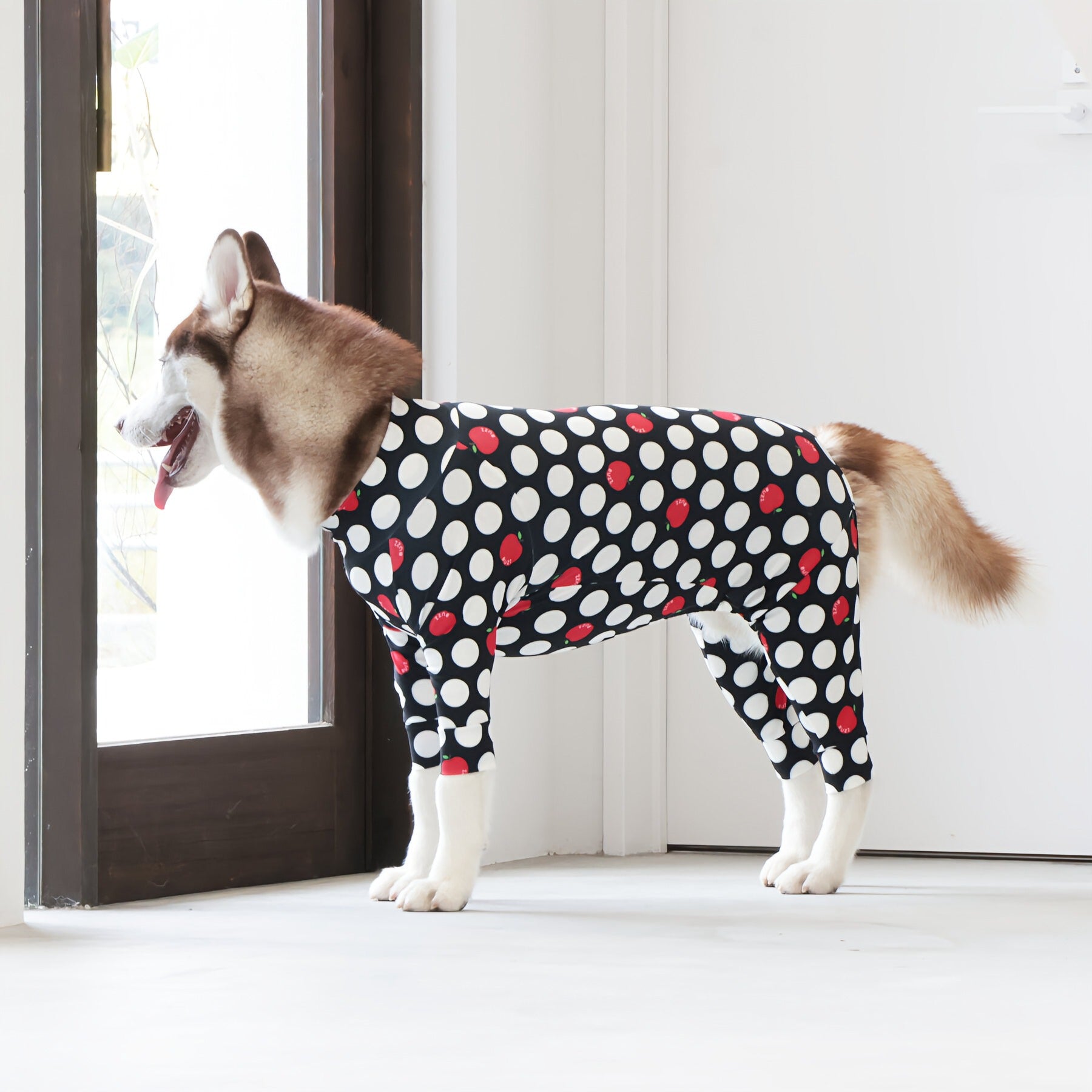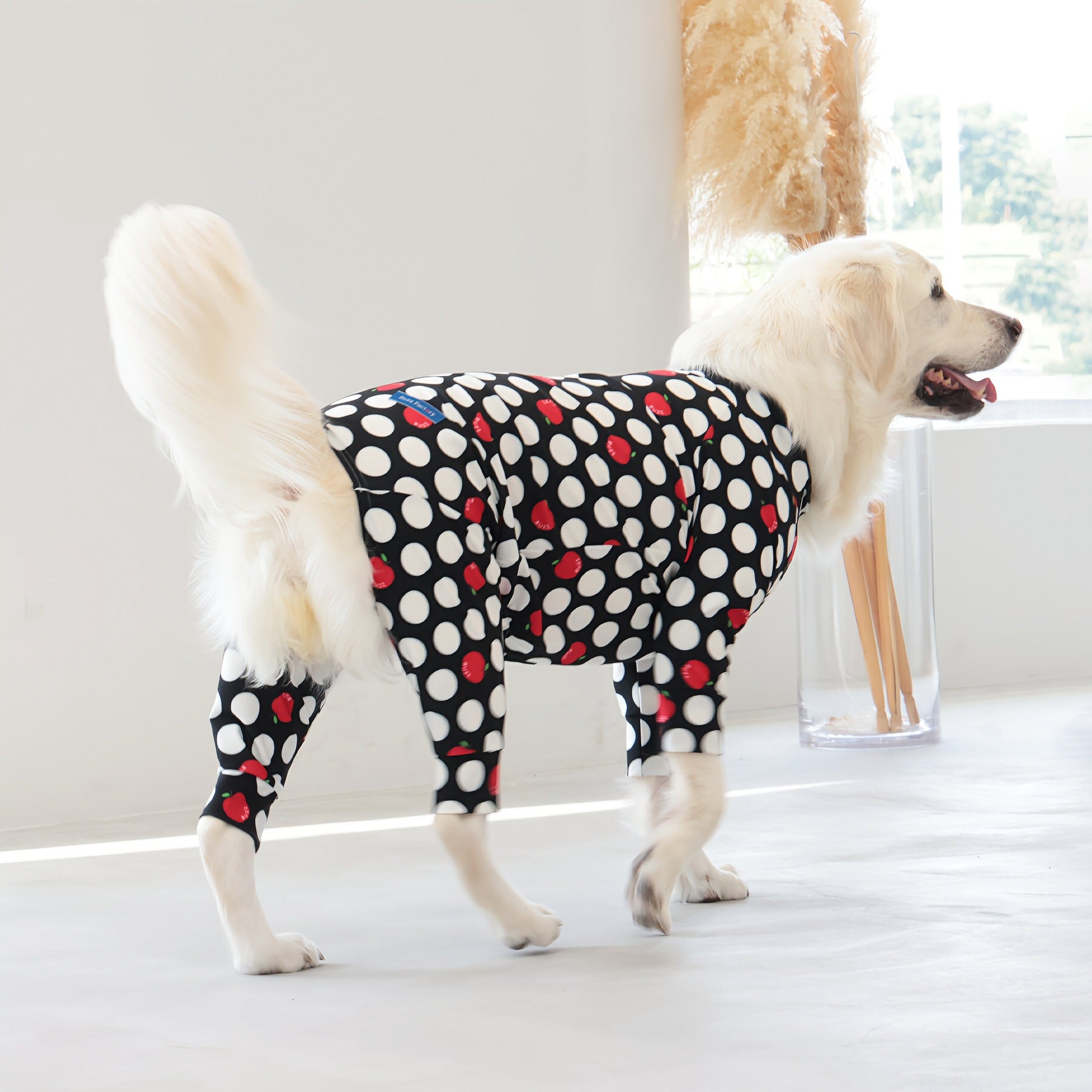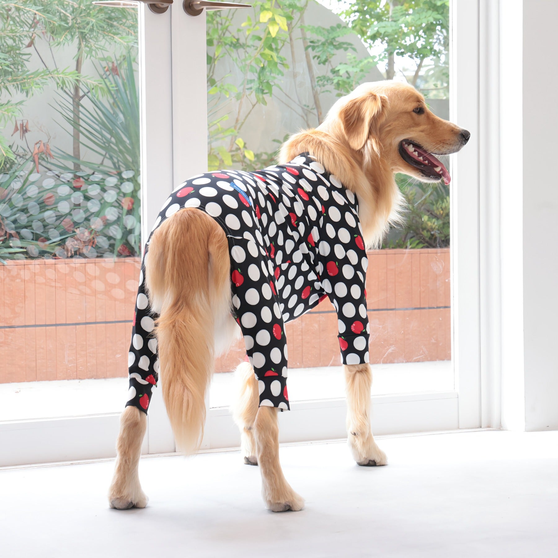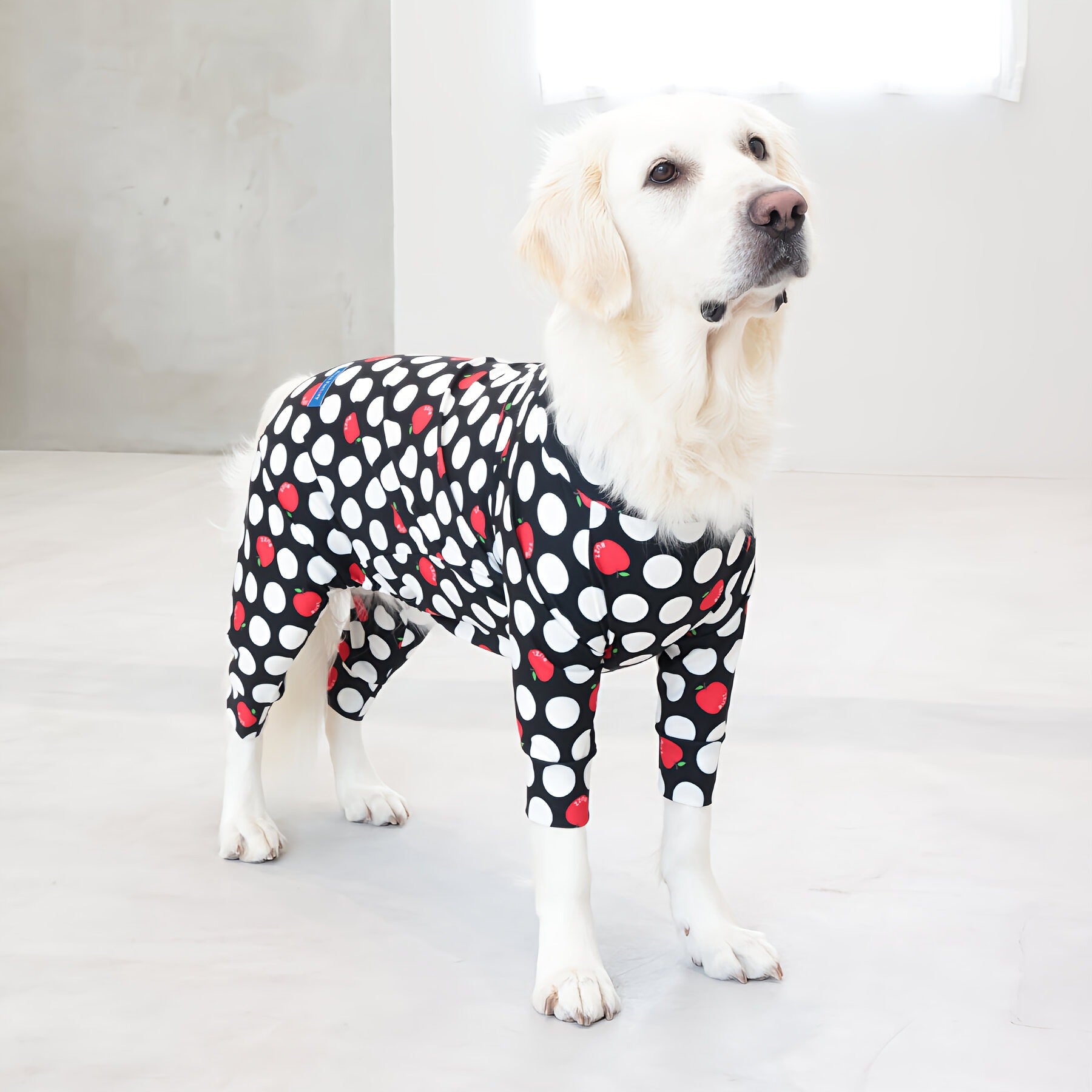 ※サイズによって値段が異なりますので、サイズをご選択していただき、値段をご確認ください。商品説明Buzz Factoryから、小さなりんごをドットに見立てた、可愛らしくもどこかレトロな新デザイン、「アップルドット」が登場しました。ブラックをベースに、落ち着いたトーンの中にレッドがアクセントとして映える一枚。ドットのように散りばめられたアップルが、クラシカルで上品な印象を演出します。【モデル①】チワワ(体重:3kg、着用:Mサイズ)【モデル②】ティーカップ・プードル(体重:1.5kg、着用:Mサイズ)【モデル③】ジャック・ラッセル・テリア(体重:6kg、着用:Lサイズ)【モデル④】トイ・プードル(体重:3kg、着用:Lサイズ)【モデル⑤】ミニチュア・シュナウザー(体重:9kg、着用:LLサイズ)【モデル⑥】ビション・フリーゼ(体重:9.5kg、着用:3Lサイズ)【モデル⑦】シベリアン・ハスキー(体重:22kg、着用:5Lサイズ)【モデル⑧】スタンダード・プードル(体重:17kg、着用:5Lサイズ)【モデル⑨】イングリッシュ・ゴールデン・レトリーバー(体重:28kg、着用:6Lサイズ)【モデル⑩】ゴールデン・レトリーバー(体重:32kg、着用:6Lサイズ)【モデル11】フレンチ・ブルドッグ(体重:11.8kg、着用:FPGサイズ)生地の特徴伸縮性や形態安定にとても優れており、アウトドアやお出かけにオールシーズンで活躍してくれます。日本製・洗濯可能なので安心かつイージーケアな素材感になります。ロンパース / Rompers とはわんちゃん用の専用ウェアとして、散歩中やドッグランでの防汚効果や野生のノミ・ダニ予防、屋内や車内での抜け毛予防、手術や治療後の舐め防止など、多くの利点がございます。サイズ標準サイズ:S、M、L、LL、3L、4L、5L、6Lフレンチ・パグサイズ:FPGダックスフンド:DFS(Sサイズ)、DFM(Mサイズ)※サイズ測定はサイズ表をご覧ください。素材 / 仕様ポリエステル 83%、ポリウレタン 17%ロンパースタイプ(4つ足用)素材感生地の厚さ:普通透け感:透けない(白地のみ:やや透ける)伸縮性:あり裏地:なしポケット:なし内容量本製品×1原産国日本洗濯絵表示洗濯可能本製品のお取り扱い-