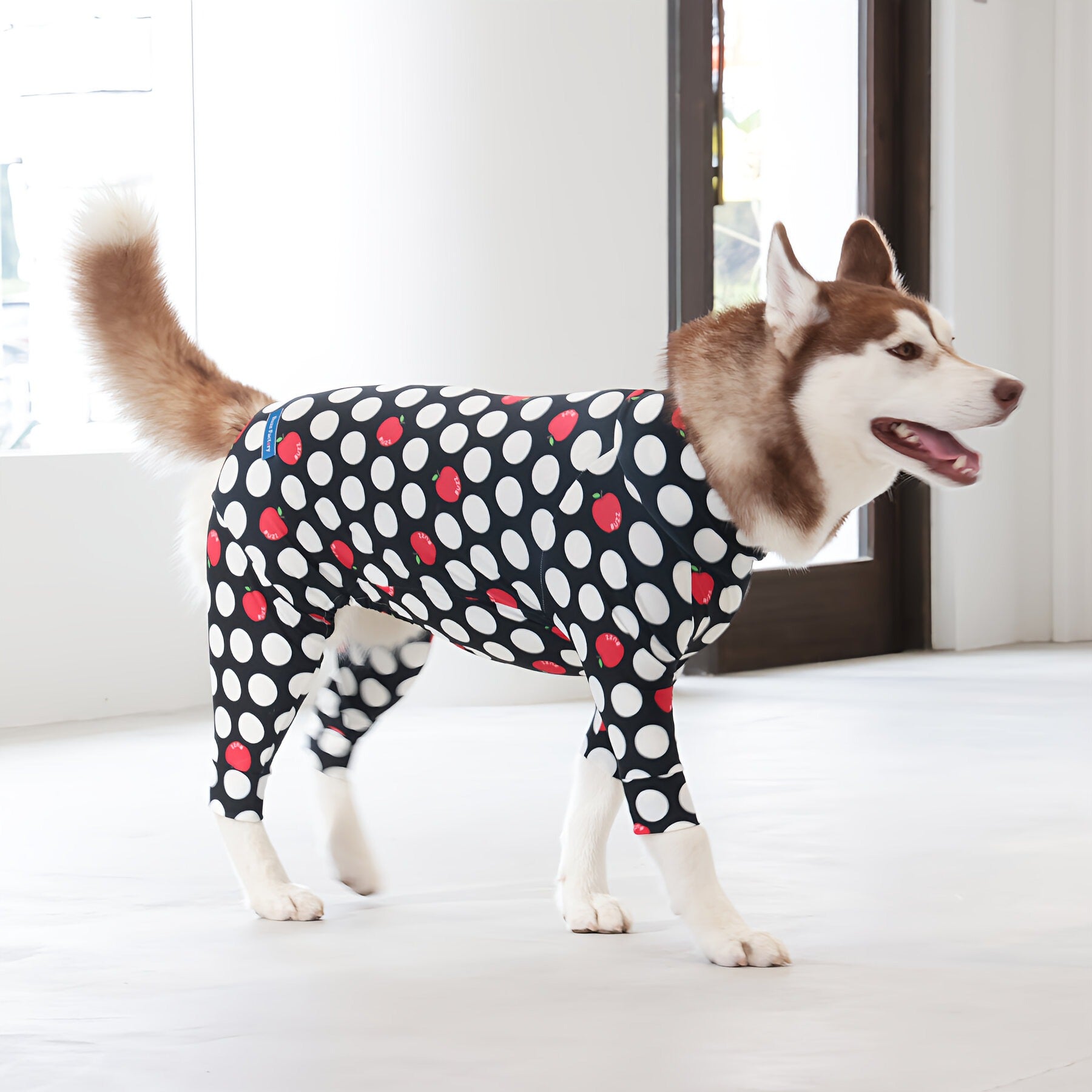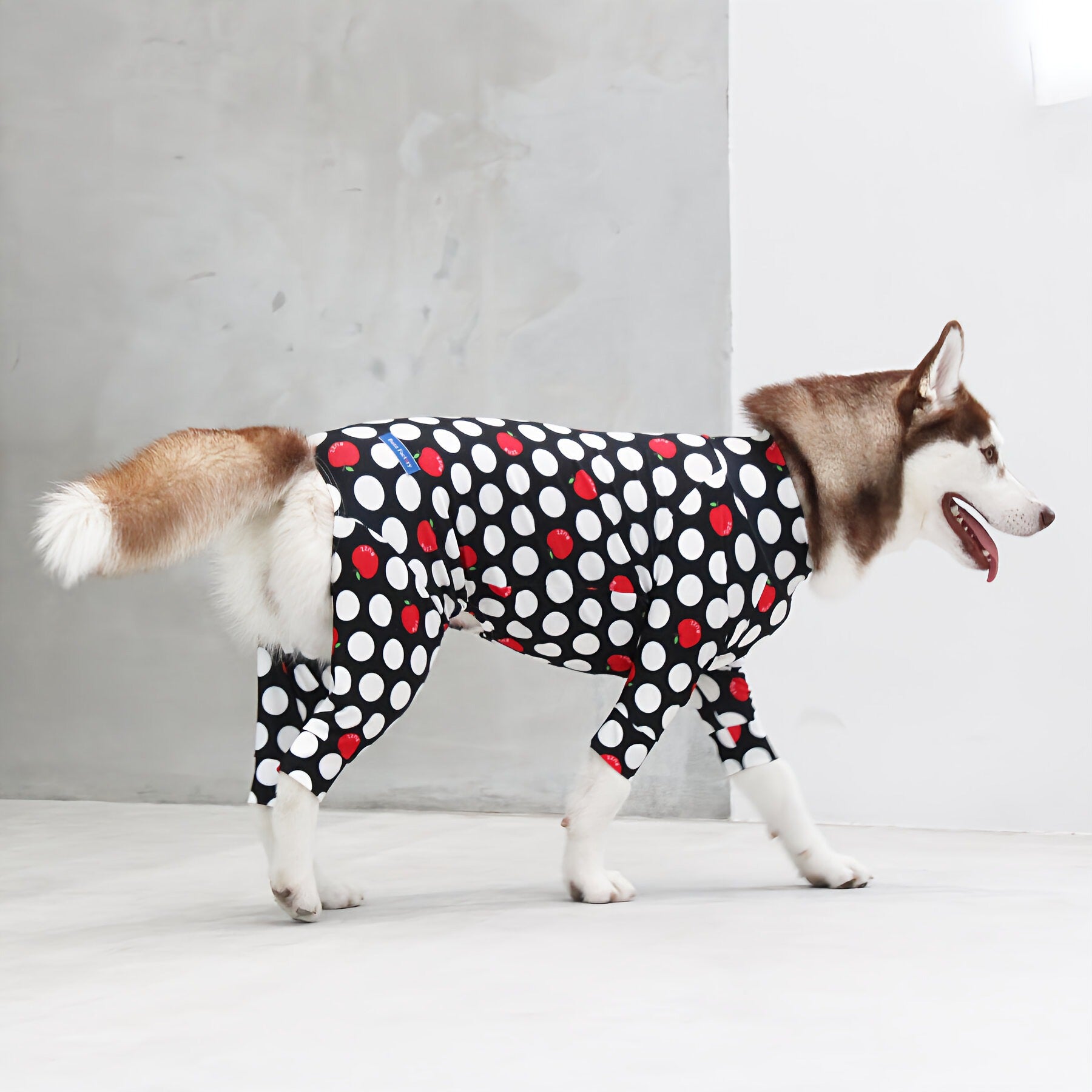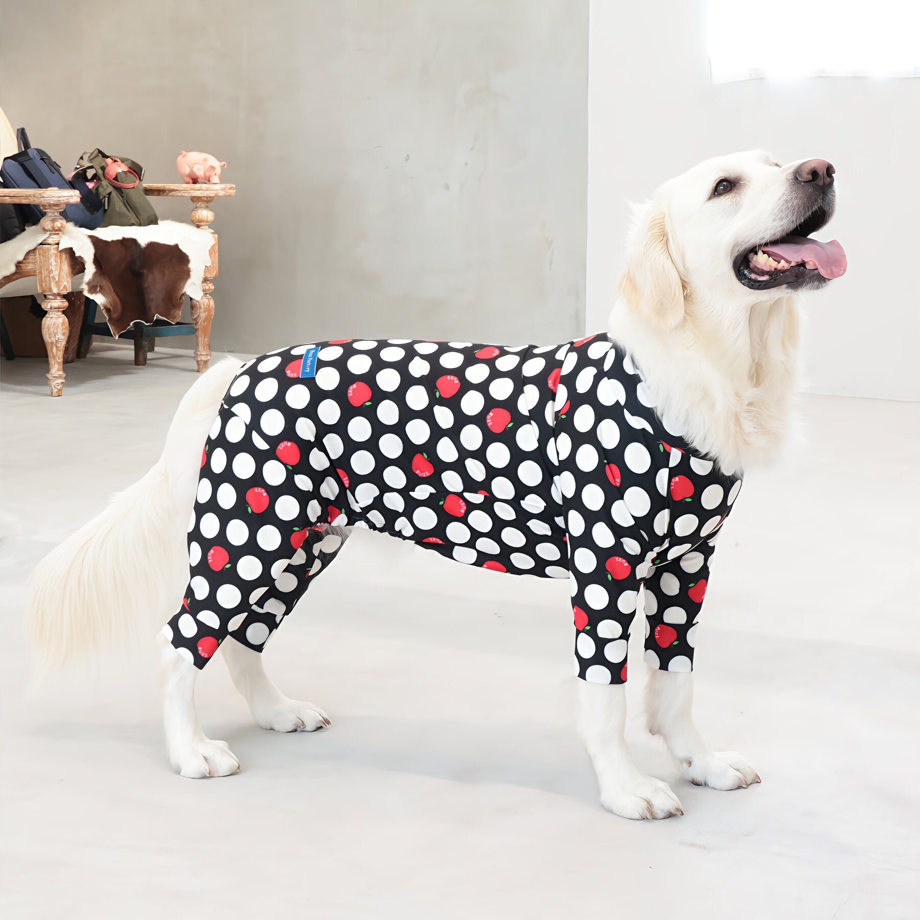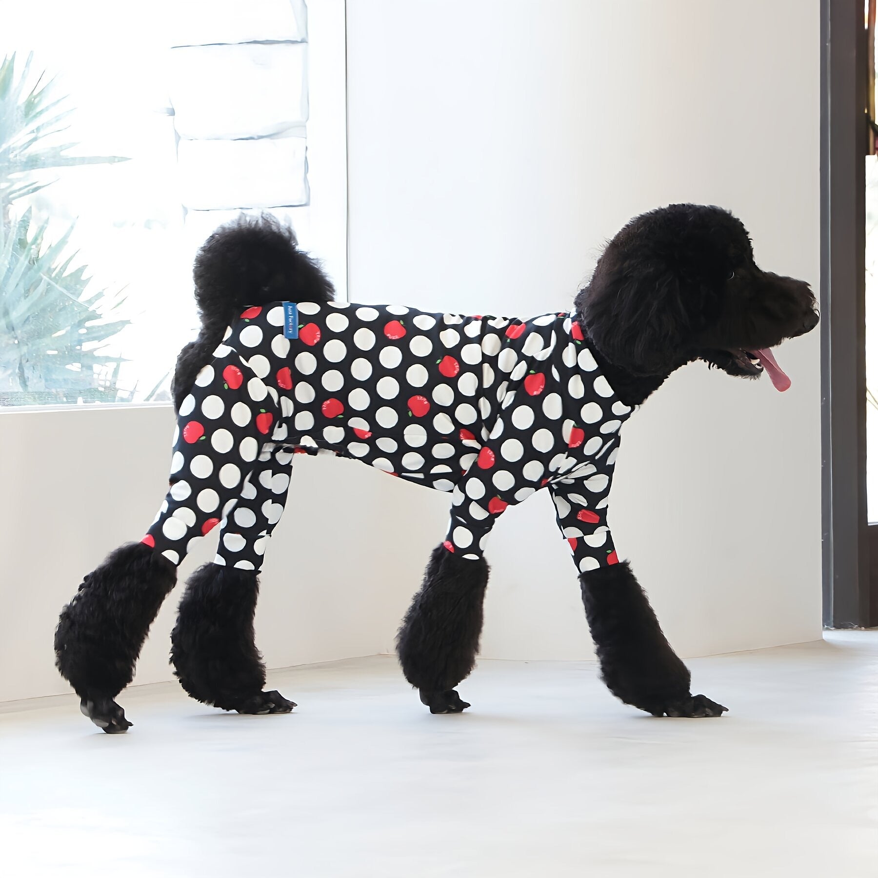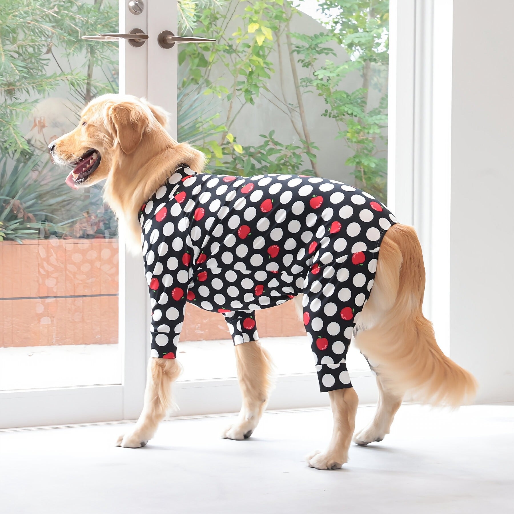 ※サイズによって値段が異なりますので、サイズをご選択していただき、値段をご確認ください。商品説明Buzz Factoryから、小さなりんごをドットに見立てた、可愛らしくもどこかレトロな新デザイン、「アップルドット」が登場しました。ブラックをベースに、落ち着いたトーンの中にレッドがアクセントとして映える一枚。ドットのように散りばめられたアップルが、クラシカルで上品な印象を演出します。【モデル①】チワワ(体重:3kg、着用:Mサイズ)【モデル②】ティーカップ・プードル(体重:1.5kg、着用:Mサイズ)【モデル③】ジャック・ラッセル・テリア(体重:6kg、着用:Lサイズ)【モデル④】トイ・プードル(体重:3kg、着用:Lサイズ)【モデル⑤】ミニチュア・シュナウザー(体重:9kg、着用:LLサイズ)【モデル⑥】ビション・フリーゼ(体重:9.5kg、着用:3Lサイズ)【モデル⑦】シベリアン・ハスキー(体重:22kg、着用:5Lサイズ)【モデル⑧】スタンダード・プードル(体重:17kg、着用:5Lサイズ)【モデル⑨】イングリッシュ・ゴールデン・レトリーバー(体重:28kg、着用:6Lサイズ)【モデル⑩】ゴールデン・レトリーバー(体重:32kg、着用:6Lサイズ)【モデル11】フレンチ・ブルドッグ(体重:11.8kg、着用:FPGサイズ)生地の特徴伸縮性や形態安定にとても優れており、アウトドアやお出かけにオールシーズンで活躍してくれます。日本製・洗濯可能なので安心かつイージーケアな素材感になります。ロンパース / Rompers とはわんちゃん用の専用ウェアとして、散歩中やドッグランでの防汚効果や野生のノミ・ダニ予防、屋内や車内での抜け毛予防、手術や治療後の舐め防止など、多くの利点がございます。サイズ標準サイズ:S、M、L、LL、3L、4L、5L、6Lフレンチ・パグサイズ:FPGダックスフンド:DFS(Sサイズ)、DFM(Mサイズ)※サイズ測定はサイズ表をご覧ください。素材 / 仕様ポリエステル 83%、ポリウレタン 17%ロンパースタイプ(4つ足用)素材感生地の厚さ:普通透け感:透けない(白地のみ:やや透ける)伸縮性:あり裏地:なしポケット:なし内容量本製品×1原産国日本洗濯絵表示洗濯可能本製品のお取り扱い-